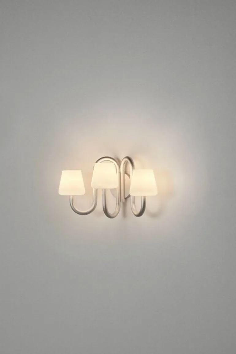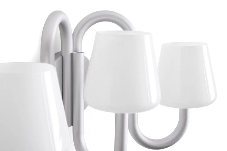 Vägglampan Apollo från HAY består av en härlig blandning av traditionella och moderna inslag. Den moderna vägglampan har skapats av Studio 0405 och består av tre bågformade armar med lampskärmar av opalglas, där de munblåsta, organiska formerna skapar en lekfull kontrast till aluminiumrören med sin industriella framtoning.