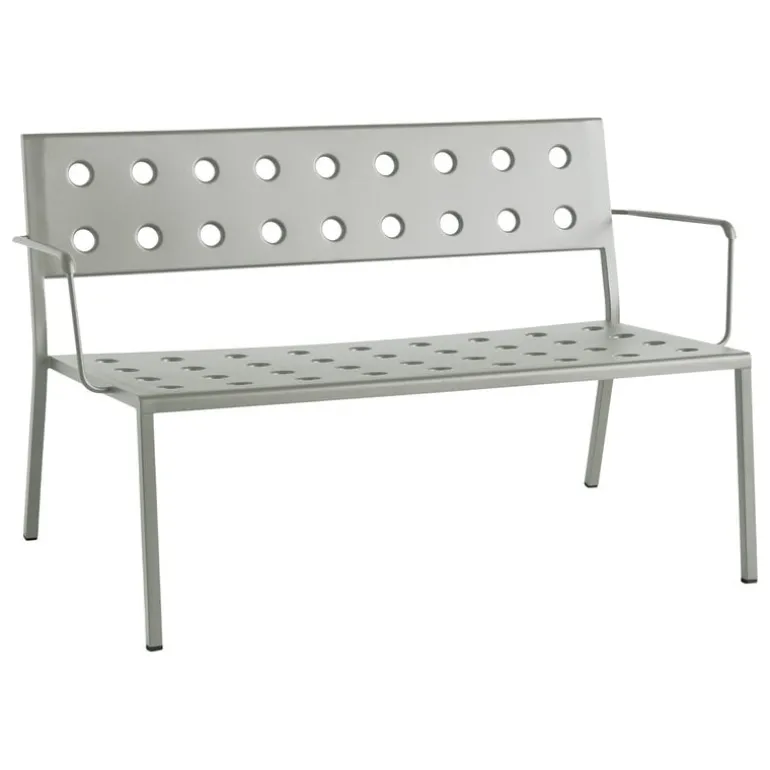 Bänken Balcony Lounge med armstöd från HAY ingår i en fiffig kollektion med utemöbler som formgivits av bröderna Bouroullec. Balconys eleganta utomhusbänkar och utomhusstolar är tillverkade av tunn stålplåt och är därför väldigt lätta och enkla att flytta – ett perfekt komplement till trädgården, altanen, terrassen eller balkongen. De runda, stansade hålen i stålplåten tjänar flera syften – de tonar ner och ger karaktär åt den geometriska designen, medan regnvattnet kan sippra ner genom bänkytan samtidigt som möbelns struktur också blir starkare. Balcony-kollektionen har behandlats med en väderbeständig beläggning och möblerna är därför precis så lättskötta som de ser ut.