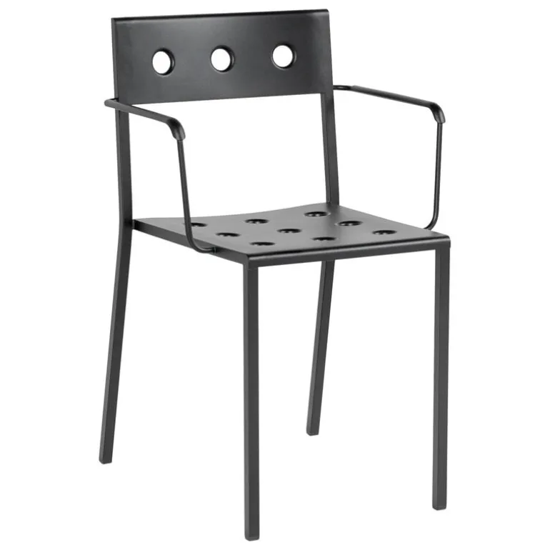 De runda hålen som pressats genom stålplåten har flera funktioner: de ger karaktär och mjukhet till den geometriska designen och låter regnvatten rinna av stolens yta, samtidigt som de stärker möbelns struktur. Med en väderbeständig beläggning är Balkongkollektionen lika bekymmersfri som den ser ut.