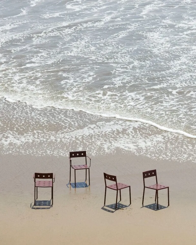 De runda hålen som pressats genom stålplåten har flera funktioner: de ger karaktär och mjukhet till den geometriska designen och låter regnvatten rinna av stolens yta, samtidigt som de stärker möbelns struktur.