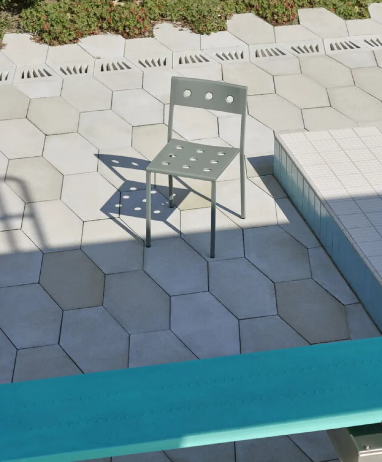 De runda hålen som pressats genom stålplåten har flera funktioner: de ger karaktär och mjukhet till den geometriska designen och låter regnvatten rinna av stolens yta, samtidigt som de stärker möblernas struktur.