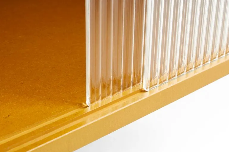 HAY:s Colour Cabinet kombinerar en elegant och funktionell design med starka, dynamiska färger. Skåpet är tillverkat av robusta Valchromat-paneler gjorda av certifierat trä, och dess yta livas upp av små träfibrer. Stående på smala stålbensben kan detta vitrinskåp användas, till exempel, för att förvara böcker, porslin och kontorsmaterial i vilket rum du vill. Designen kompletteras av skjutdörrar i glas med en räfflad textur.