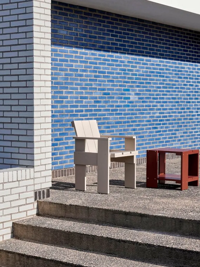 Utomhusstolen Crate är baserad på den ursprungliga Crate-stolen som designades av den nederländska arkitekten och designern Gerrit Thomas Rietveld år 1934. På den tiden tillverkades stolen av överblivna fraktlådor i trä, men i Rietveld Originals och HAY:s nytolkning används istället lackad furu. Matstolen Crate har en väderbeständig beläggning, vilket gör den perfekt som utestol på altanen, balkongen eller i trädgården.