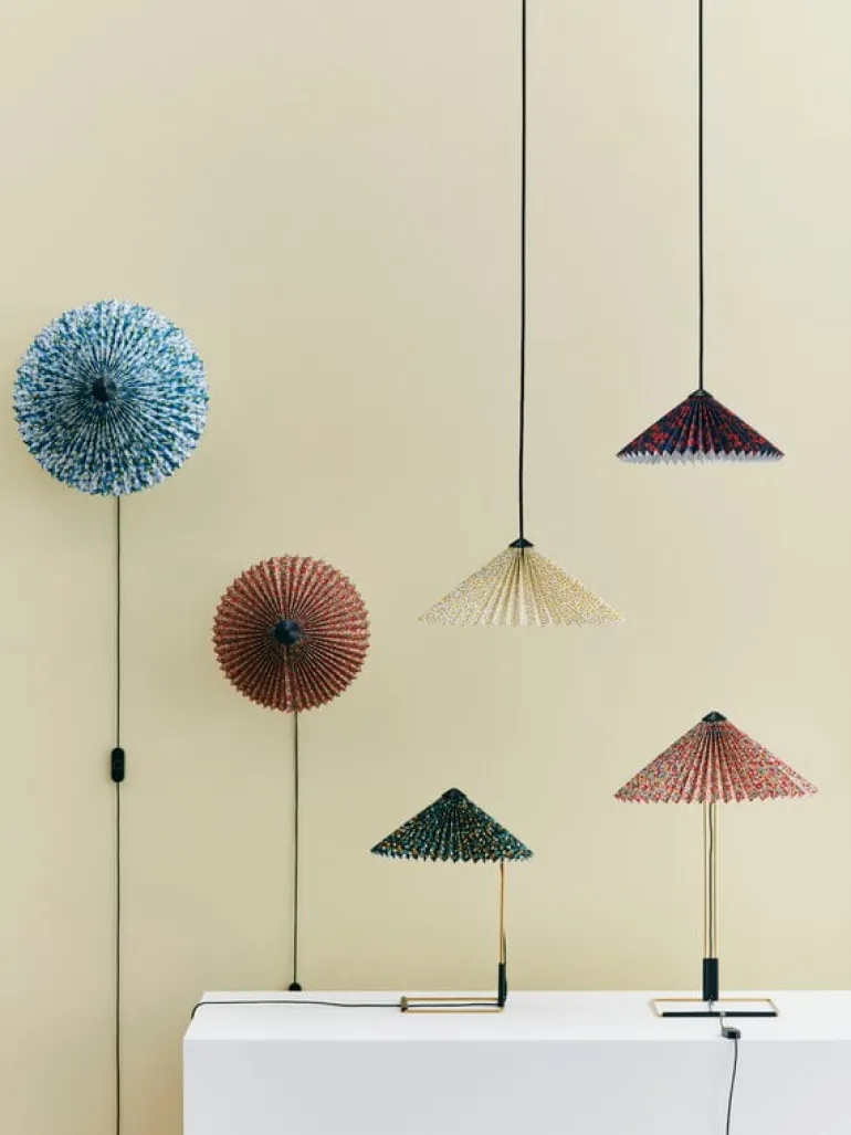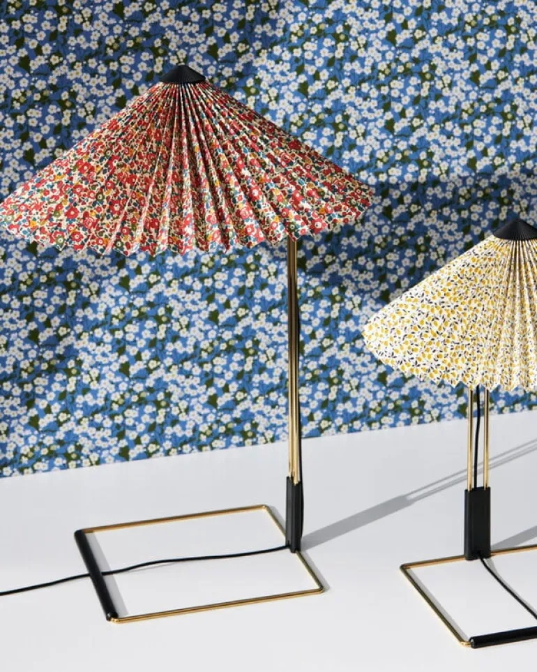 Om du inte har varit i London så är Liberty ett lyxvaruhus och historiskt landmärke som är känt för sina starka band till konst, design och kultur. Det de är mest kända för är sina effektfulla blomtyger, som på ett genialiskt sätt införlivats i Matin-lampskärmarnas veckade utförande. Lamporna i kollektionen har dessutom fått sina namn efter tygdesignerna. Genom att lampans fot är gjord av ståltråd med en yta av polerad mässing, så förenas poesi och visuell finess med fysisk styrka, medan Libertys lekfullt utformade tryck lägger till ytterligare en nivå i Sempés smarta design, där hon låter det klassiska kontrastera det moderna.