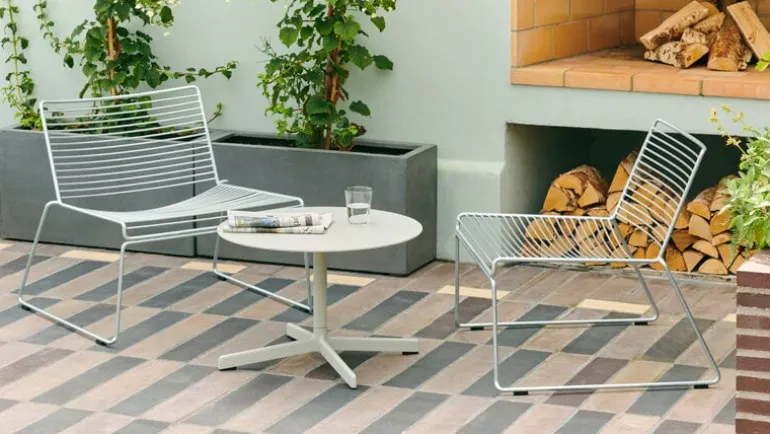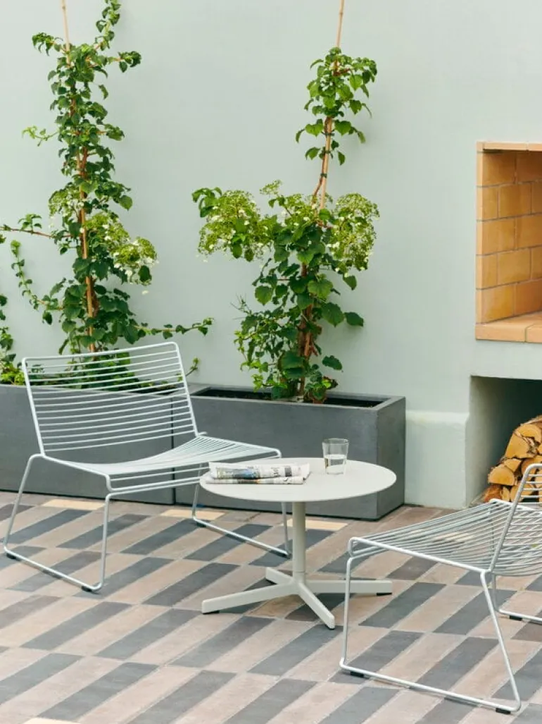HAY:s fåtölj Hee är en modern designklassiker som kännetecknas av sin luftiga metallstruktur som påminner om en tredimensionell streckteckning. Hee-fåtöljen är tillverkad av galvaniserat stål och tål att utsättas för konstant fukt och temperaturväxlingar utan att rosta – den här underhållsfria utomhusfåtöljen passar även i de tuffaste förhållandena, från saltstänkta kustklimat till oförutsägbara nordiska väderförhållanden.