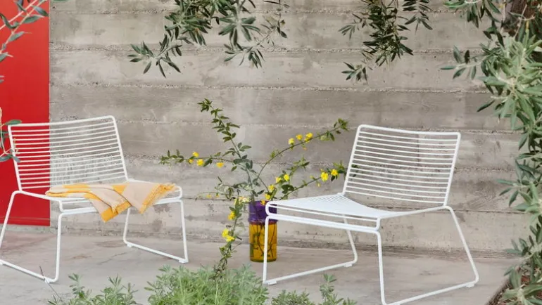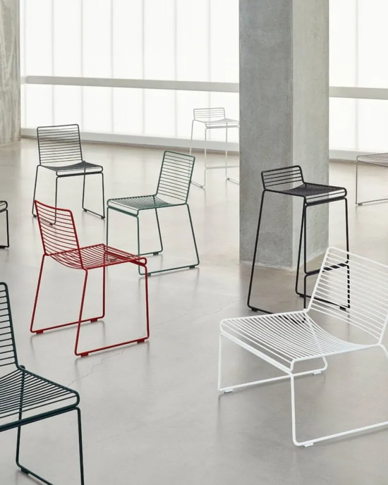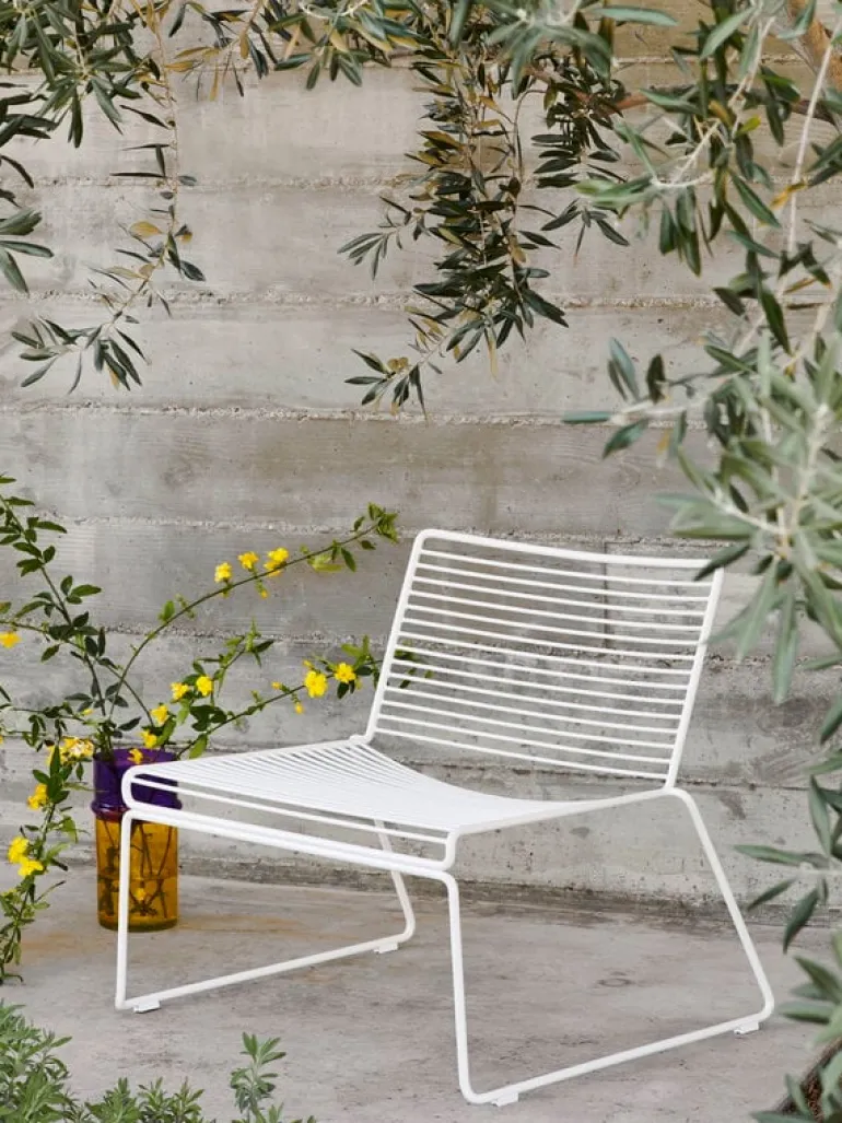 Hee fåtölj från HAY är en ikonisk möbel med en luftig metallram som liknar en skiss i rymden. Tillverkad av elförzinkad ståltråd och belagd med en slitstark pulverlack, passar Hee loungestol lika bra inomhus som utomhus.