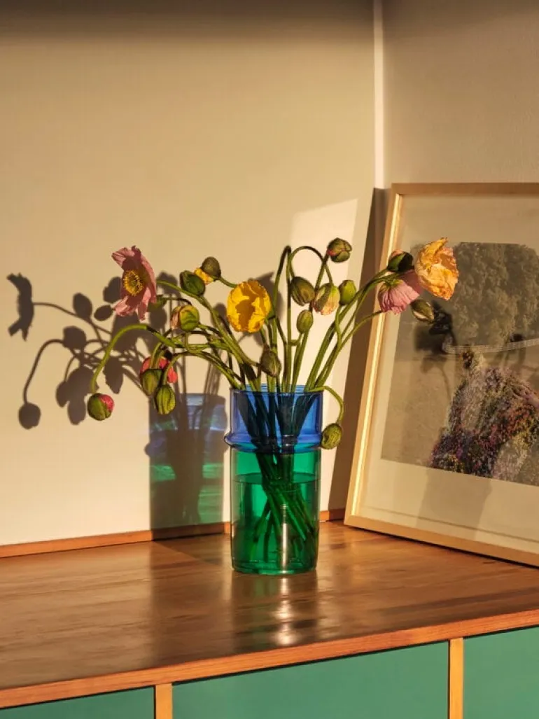 Vasen Moroccan från Hay ger extra färg åt dina blomsterbuketter, ris och kvistar. Vasen, som är cylinderformad med en bredare ring ovanför midjan, låter glasytornas framträdande färgkontraster spela mot varandra. Vasen är munblåst och gjord av återvunnet glas i Marocko.