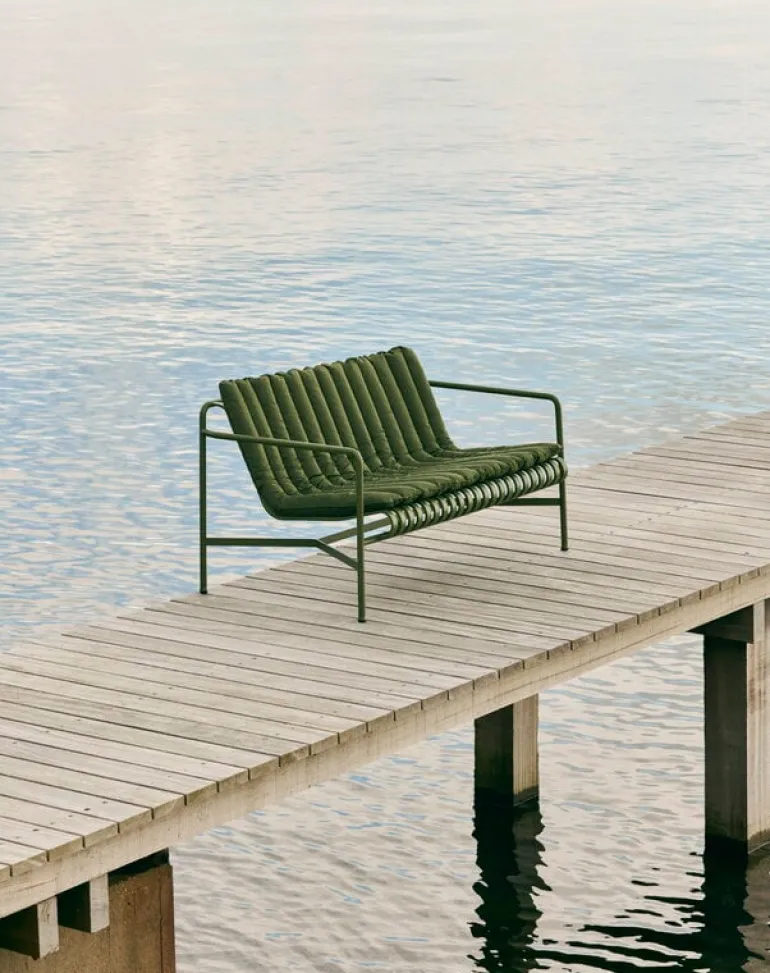 Den eleganta men ändå robusta Palissade-soffan är medlem i Hays mångsidiga kollektion av utemöbler. Palissade utemöbler har en kraftfull, grafisk design som består av enkla stålrör och lameller. Ronan och Erwan Bouroullec arbetade med kollektionen i två år och skapade en kollektion med enkla, välavvägda möbler som lämpar sig väl för terrasser, balkonger, trädgårdar, kaféer och offentliga utrymmen. Palissade stolar, bord och bänkar är robusta men eleganta, och perfekta för utomhusbruk, eftersom vind och vatten kommer att passera genom den galvaniserade stålramen. Palissade-möblerna är gjorda för att åldras vackert, och paletten med dämpade färger förstärker intrycket av tidlöshet och mångsidighet.