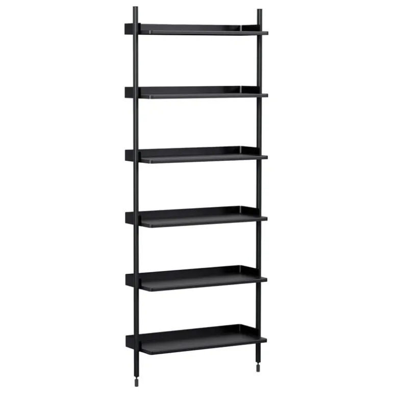 Den här Pier System-förvaringskombinationen består av sex nivåer som hålls uppe av svarta plastkonsoler. Stålhyllorna kan bära upp till 15 kg vardera och har en mörkgrå finish med en ännu lite mörkare kant på baksidan, vilket ger en fin kontrast till den eleganta, minimalistiska designen. Den lätta men tåliga aluminiumramen garanterar både funktionalitet och en tidlös stil.