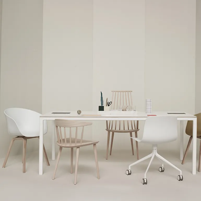 Hays T12-bord har en minimalistisk form som gör det till ett fantastiskt skrivbord eller matbord, lämpligt för alla utrymmen och inredningar. Metallbenen på T12-bordet har placerats i hörnen på bordet för att maximera antalet sittplatser runt det – designen är perfekt för en större grupp människor, i matsalen eller på kontoret.