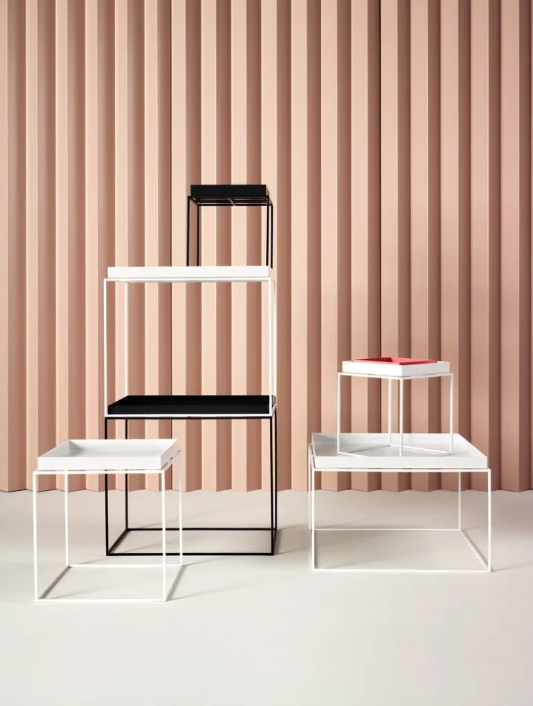 Hays bord Tray ger vardagsrummet ett nytt utseende. Stora, traditionella soffbord kan bytas ut mot en snygg grupp mindre Tray-bord. Tray består av en enkel, pulverlackerad stålram och en avtagbar bricka. Borden kan användas som soff- eller sidobord i vardagsrummet eller som nattduksbord i sovrummet – var som helst där extra bordsyta behövs. Kombinera brickbordet Tray med de mindre, funktionella Hay-brickorna för att skapa en monokrom look eller sätta lite färg.