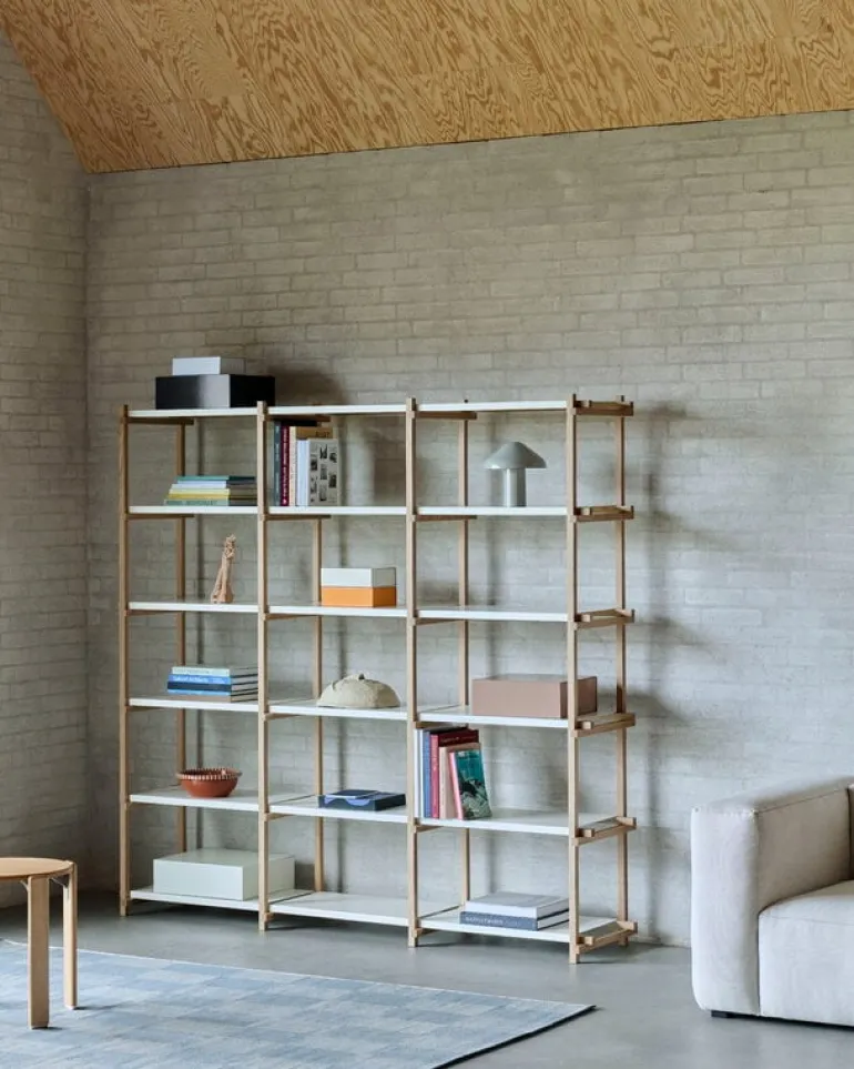 HAY:s hylla Woody ger en modern touch till traditionella hyllsystem i stegform. Designen, som omfamnar modernistiska principer, låter alla strukturella element, fogar och skruvar vara synliga, och hyllar snarare hyllans konstruktion än döljer den. Detta minimalistiska tillvägagångssätt ger Woody-hyllan sin distinkta, moderna elegans, samtidigt som fokus kan ligga på de föremål som står på hyllan – oavsett om det är köksredskap, böcker eller dina favoritprydnader.