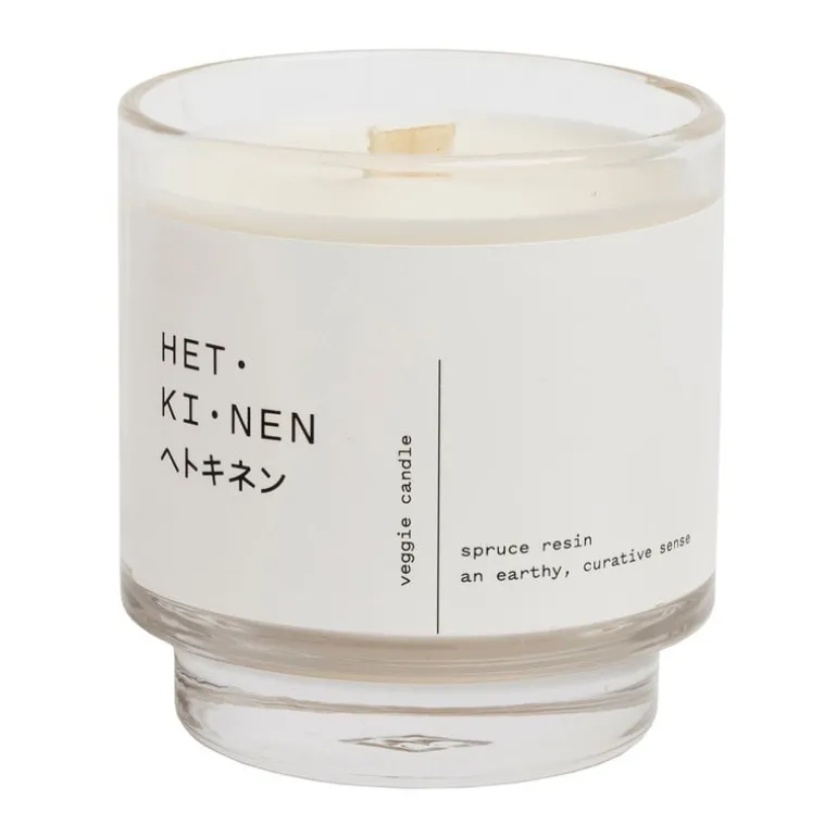 Vaxljuset Veggie från Hetkinen brinner med en vacker, flackande låga tack vare den naturliga träveken av asp. Det behagliga sprakandet från lågan skapar känslan av en glödande eldstad eller en lägereld i skogen. Ett ljus med träveke kräver lite mer än ett traditionellt ljus, men atmosfären det skapar gör det absolut värt det.