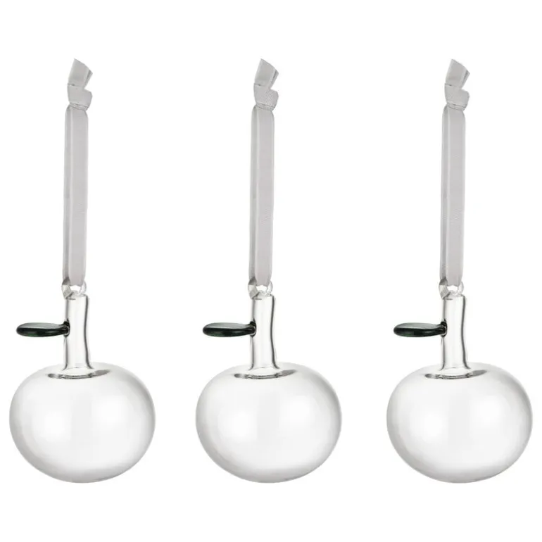 Iittalas glasäpplen kombinerar modern glaskonst med gamla jultraditioner – visste du att julgranen traditionellt pryddes med äpplen innan julgranskulorna kom? De nyckfulla prydnaderna, som är skapade av konstnären och formgivaren Oiva Toikka, kommer med små band som gör dem perfekta för granen eller kransen. De dekorativa äpplena är tillverkade av transparent glas och kommer i set om tre.