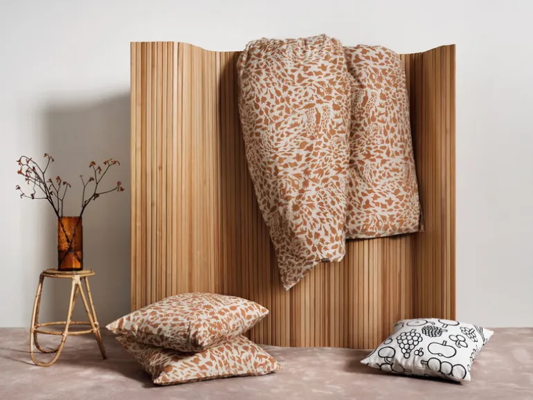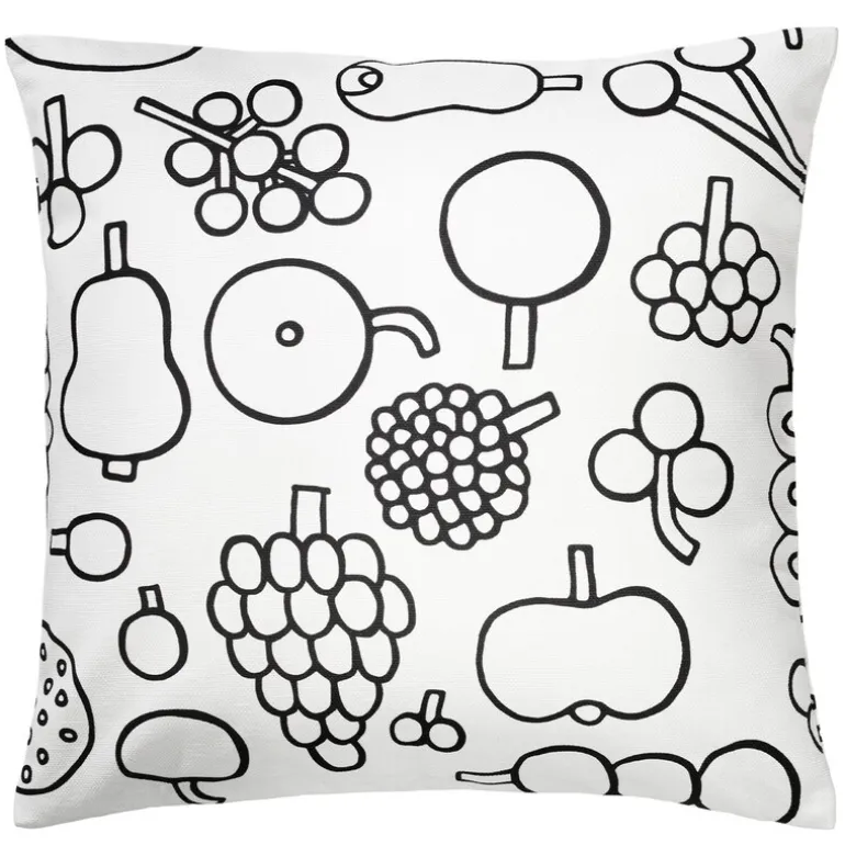 Frutta kuddfodral är en del av Iittalas kollektion med titeln Oiva Toikkas nyfikna sinne. Kollektionens föremål är dekorerade med färgstarka, livfulla mönster baserade på originalskisser och teckningar som hittats i arkiven av den finska designern och konstnären Oiva Toikka. Den lekfulla kollektionen hyllar den legendariska finska glaskonstnärens oändliga fantasi och djärva uttryck. Jag letar inte efter perfektion. Jag vill att det ska vara roligt! som Toikka själv har uttryckt det.