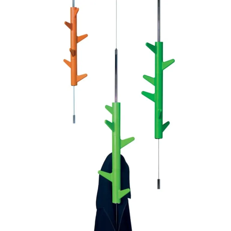 Innos vackra hängande klädhängare Oka, designad av Teppo Asikainen, hänger från taket med ståltråd. Oka är utrustad med 6 krokar och har en höjdjusteringsmekanism.