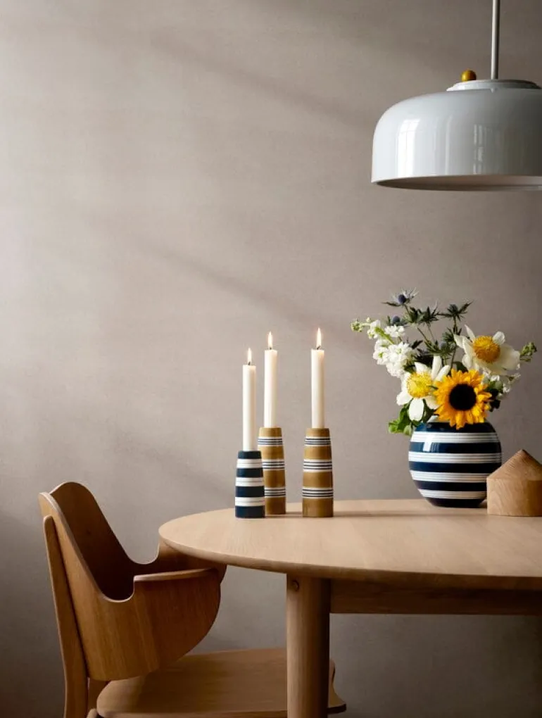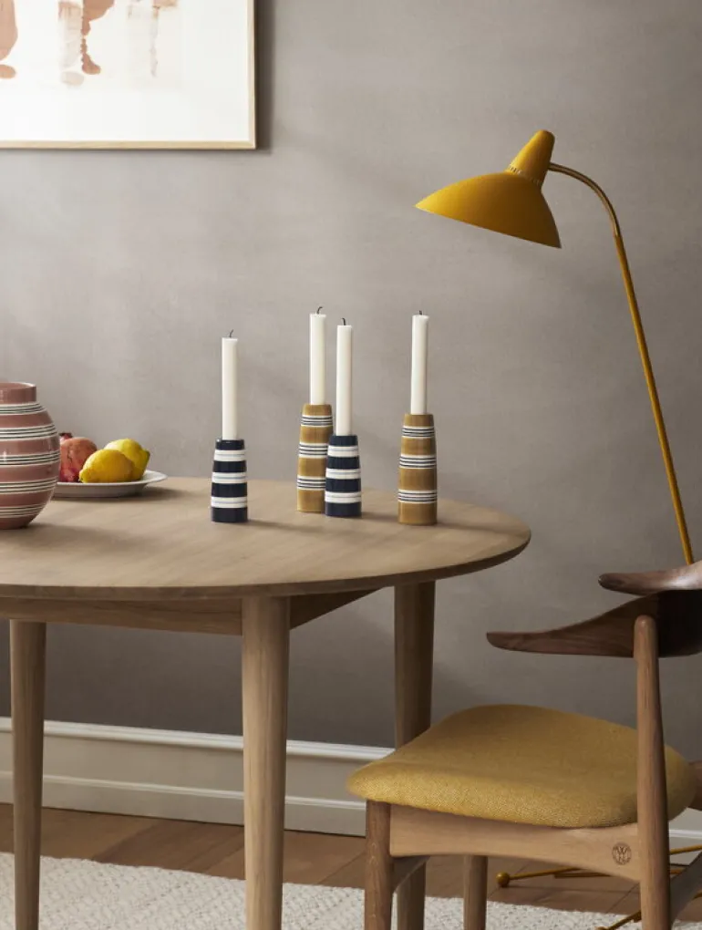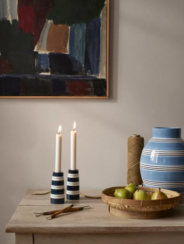 Kählers ljushållare Omaggio Nuovo har formgivits av Ditte Reckweg och Jelena Schou Nordentoft från Stilleben. Precis som de välkända Omaggio-vaserna är även Omaggio Nuovo-ljushållarna en hyllning till keramikkonstnären Sven Hammershøi, vars främsta signum var bruket av dekorativa horisontella och vertikala linjer. Keramikljushållarna Omaggio Nuovo, som har en enkel, modern design med handmålade penseldrag och glasyr, är en unik och oblyg tolkning av Hammershøis keramikföremål. Avsedd för antikljus.