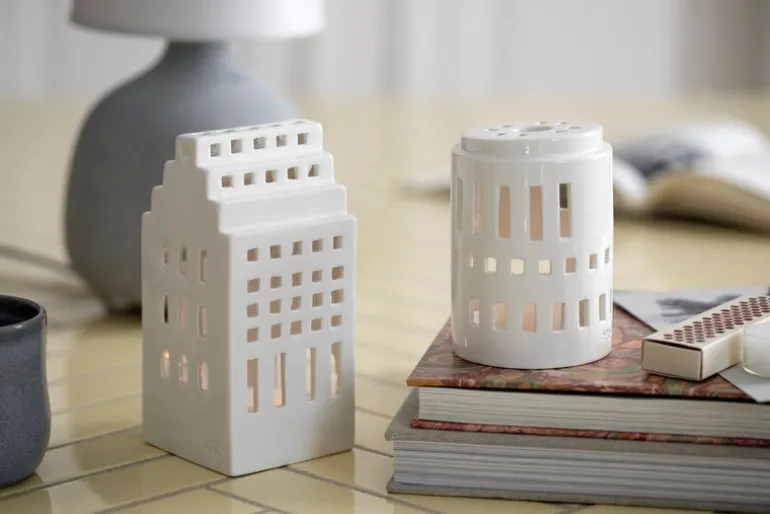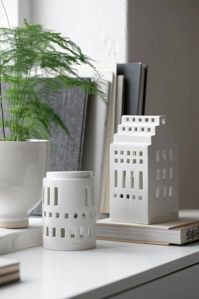 Kählers Urbania-ljuslyktor avbildar en mängd olika byggnader, från bostadshöghus till kända landmärken, och erbjuder ett modernt alternativ till mer traditionella husformade ljuslyktor. Designade av Mette Bache och Barbara Bendix Becker, är varje keramikljuslykta komplett med handskurna fönster som inte bara ger ljuslyktan ett intressant, distinkt utseende, men också låter det varma skenet från ett värmeljus kasta vackra ljusmönster runt ljuslyktan. Välj din favoritljuslykta eller samla hela serien för att skapa en hel stad av lysande fyrtorn!