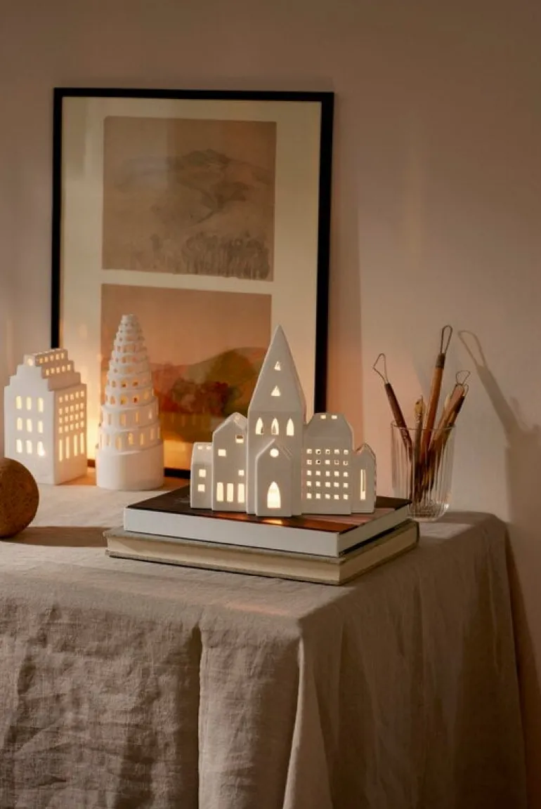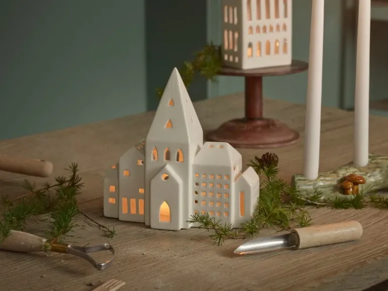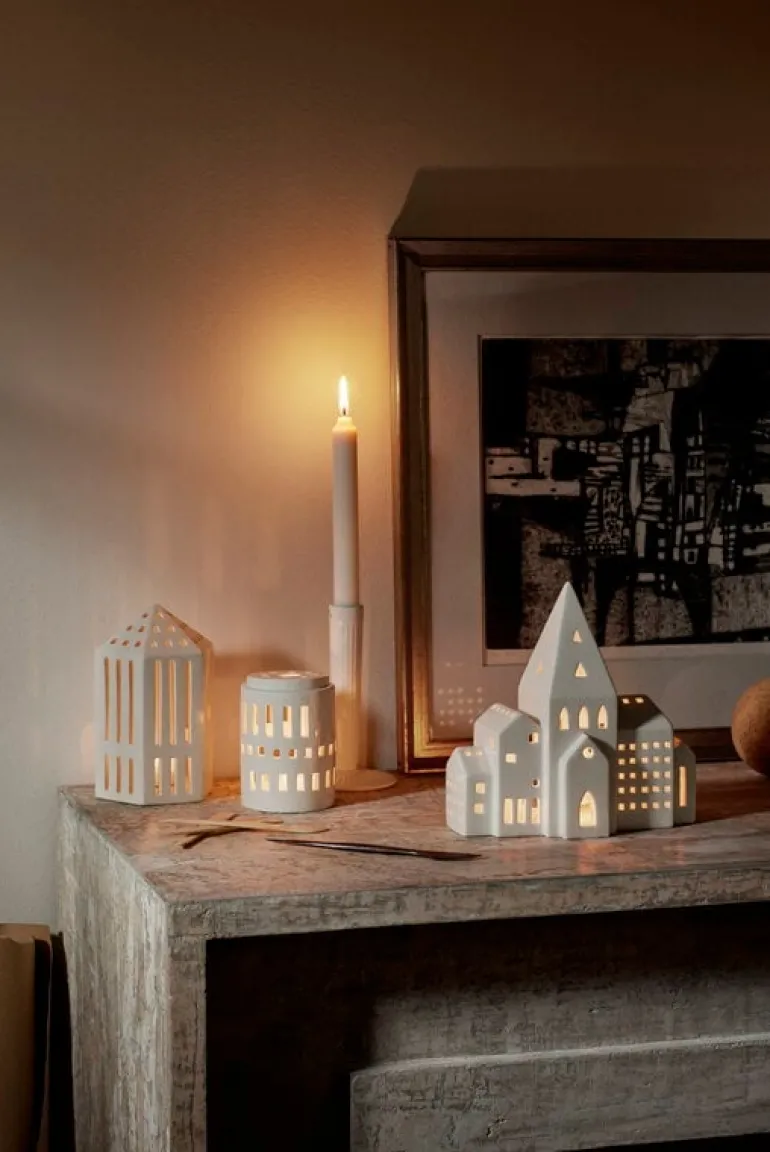 Urbania-lyktorna från Kähler omfattar flera olika byggnader, från höga bostadshus till kända sevärdheter, och erbjuder ett modernt alternativ till huslyktor med en mer traditionell form. Varje keramiklykta är formgiven av Mette Bache och Barbara Bendix Becker och har fönster som skurits ut för hand. Dessa ger inte bara lyktorna en intressant och karakteristisk form, utan får också värmeljusets mjuka sken att skapa vackra ljusmönster runt lyktan. Välj ut din favorit bland lyktorna eller samla hela serien och skapa en hel stad med skinande lyktor!