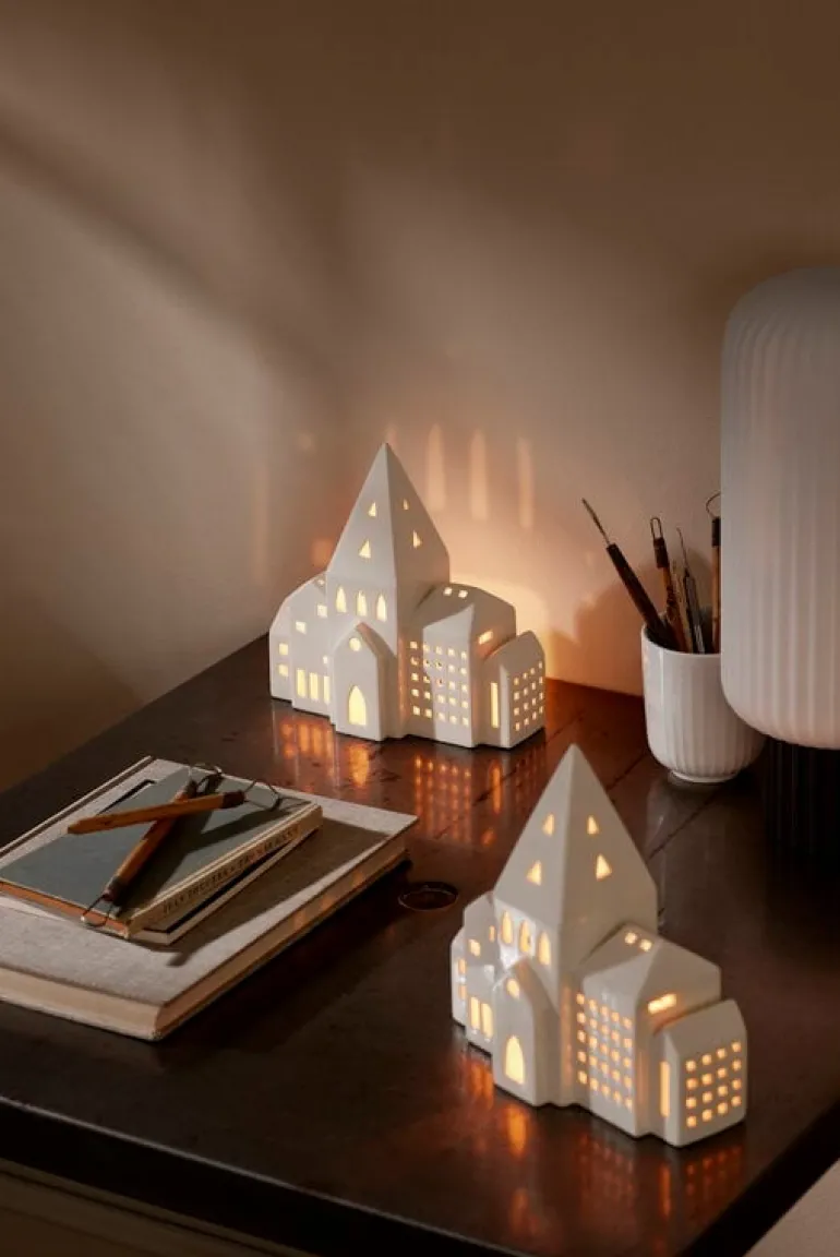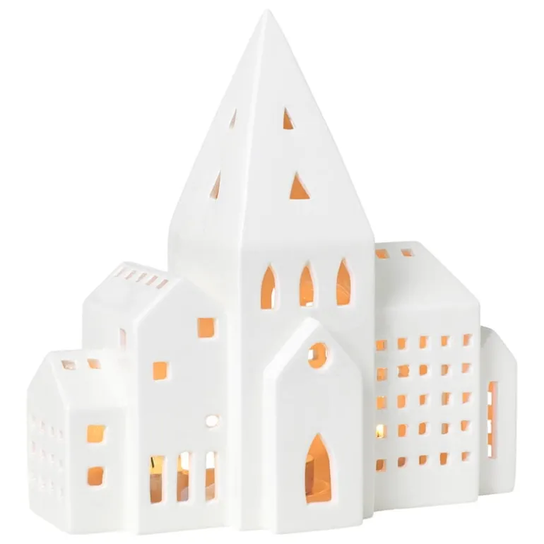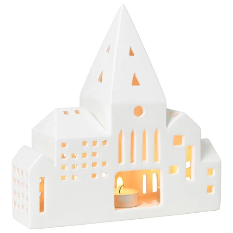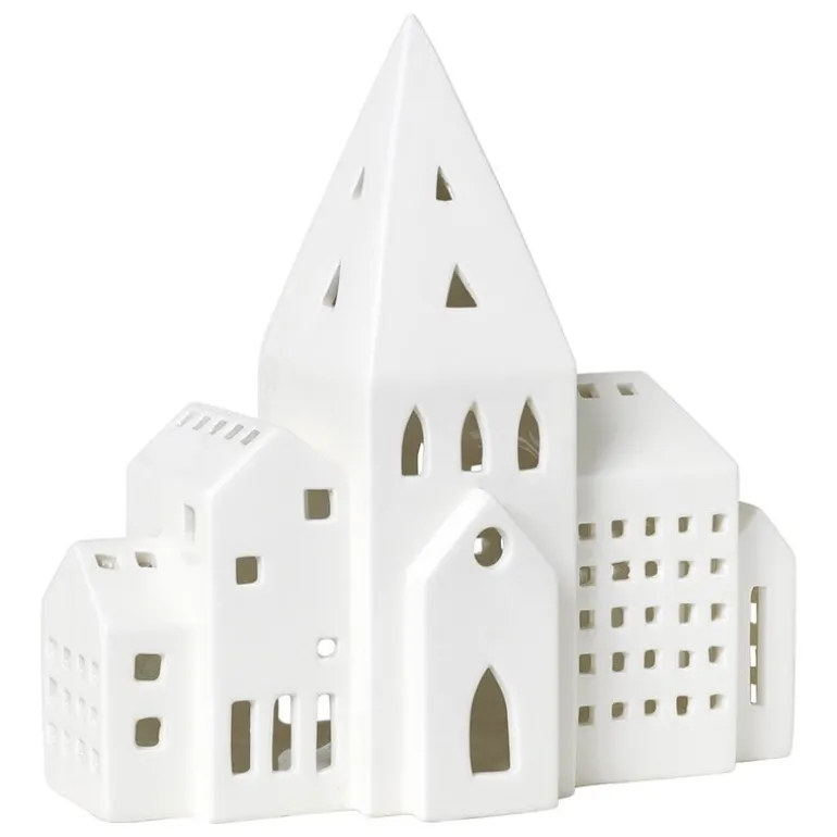 Lyktan City från Kählers Urbania-serie skildrar en rad stadsbyggnader med ett högt kyrktorn i mitten. Lyktan är gjord av keramik och har en vacker, vit glasering som finish.