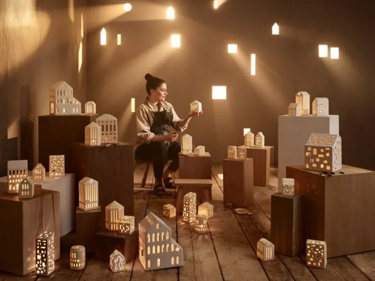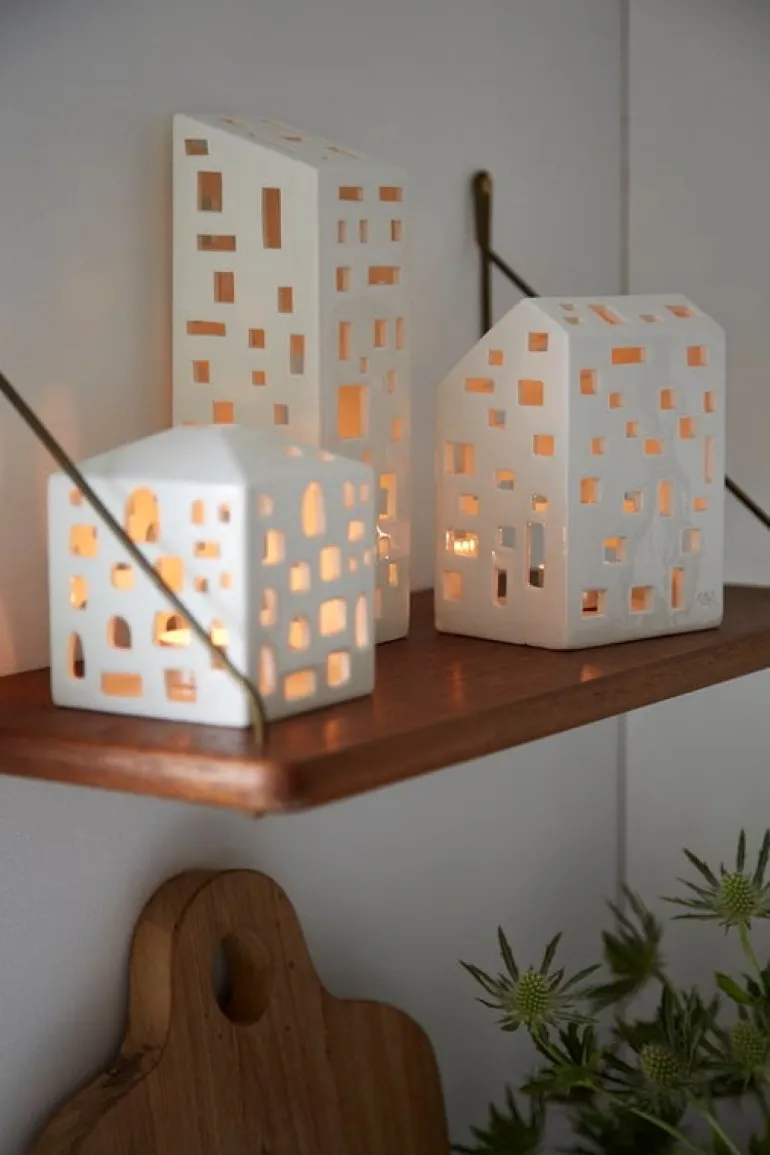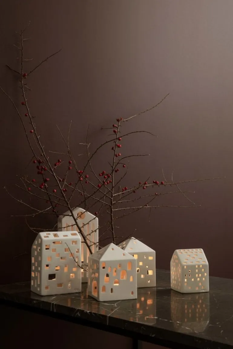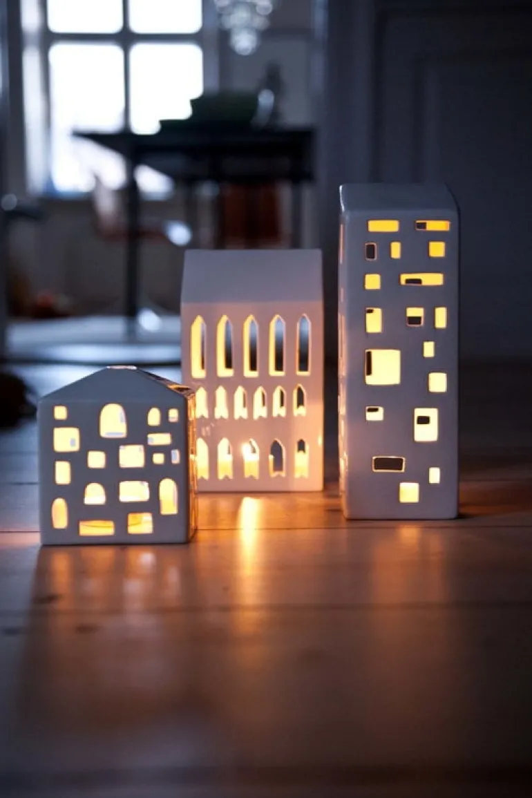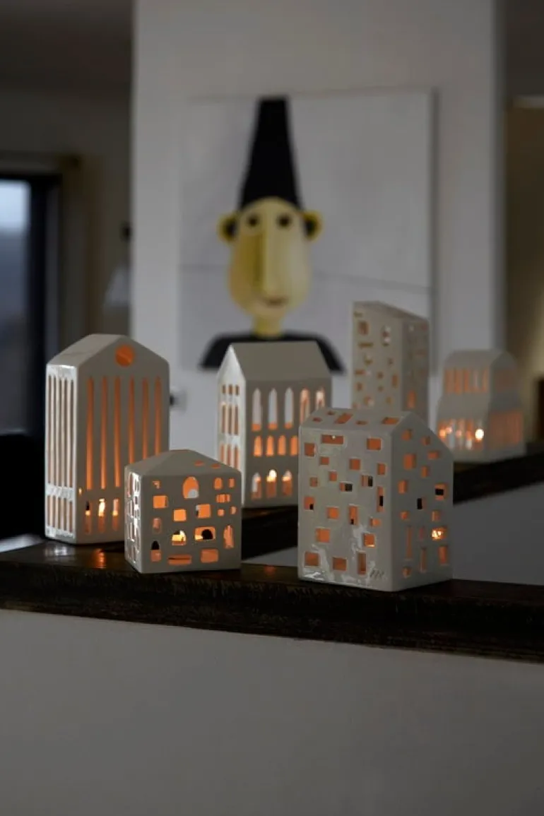 Kählers Urbania erbjuder ett mer modernt alternativ till de traditionella ljuslyktorna som ofta föreställer hus. De keramiska lyktorna, som är designade av Mette Bache och Barbara Bendix Becker, föreställer en rad olika byggnader vars levande ljus reflekteras från olika formade fönster och skapar fascinerande mönster i rummet.