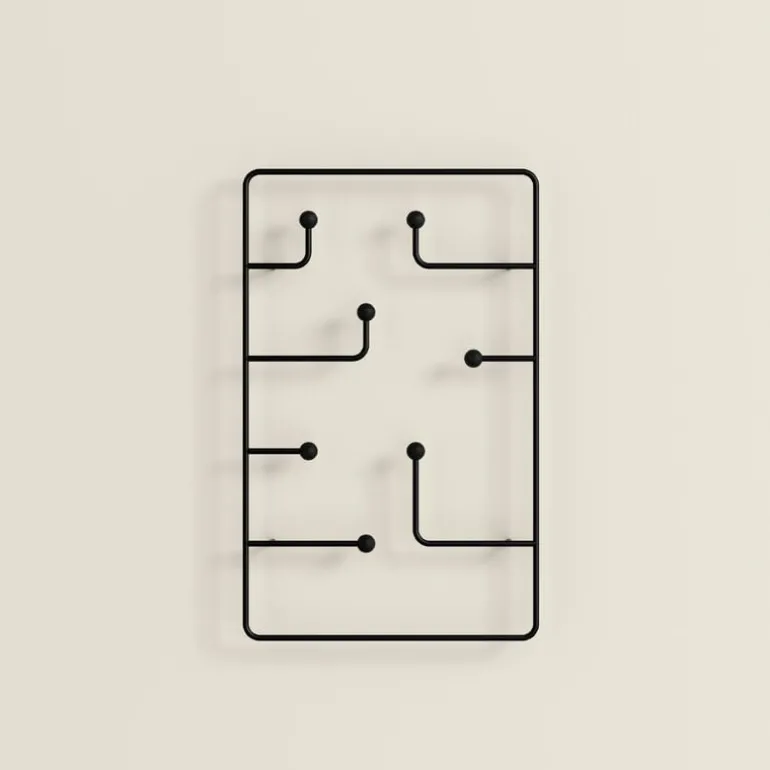 Karakters klädhängare Hang Around är en vacker, minimalistisk hängare för väggen. Den väggmonterade hängaren i stål, formgiven av Derek McLeod, passar perfekt i begränsade utrymmen, som trånga hallar, garderober och klädkammare. På den stora klädhängaren Hang Around finns sju knoppar, där du kan hänga upp allt möjligt, allt från klädesplagg till mössor och scarfar.