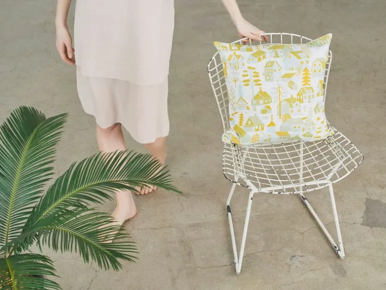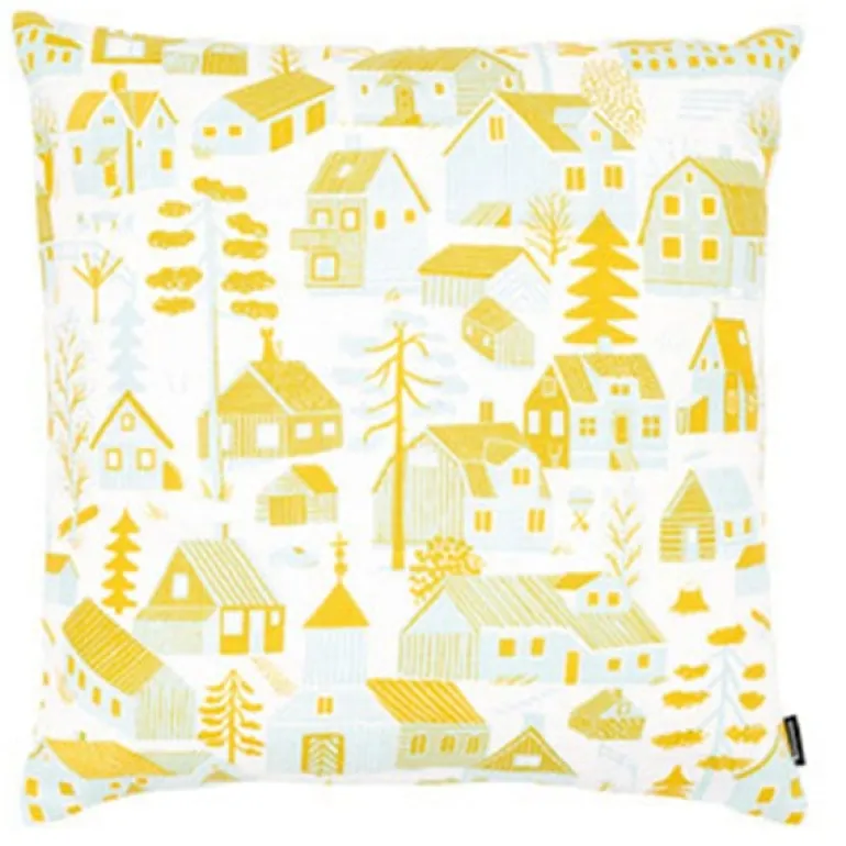 Kaunistes kuddfodral Mökkilä har ett roligt bymotiv med träd och traditionella, skandinaviska trähus, designat av den norske illustratören Bjørn Rune Lie. Det silkscreentryckta kuddfodralet är tillverkat av en blandning av linne och bomull och har en dold dragkedja på undersidan. Passar till innerkuddar som är 50 cm x 50 cm.