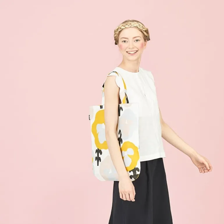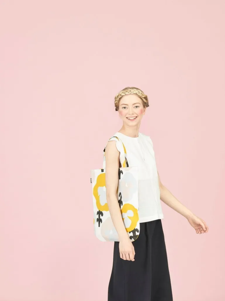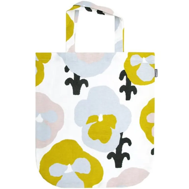 Toteväskan Orvokki från Kauniste bär Hannele Äijäläs härliga blommönster, som visar stora violer i gult, rosa och ljusblått. Väskan är tillverkad av en blandning av linne och bomull, och har måtten 38 cm x 43 cm.