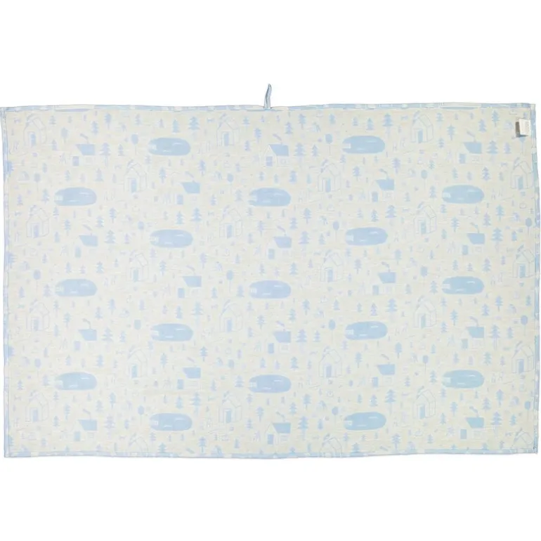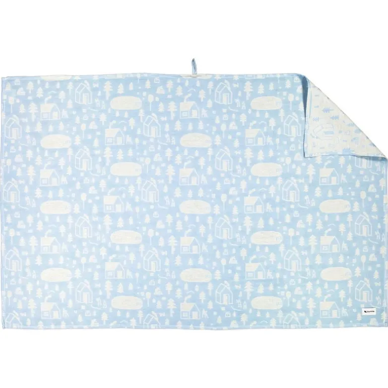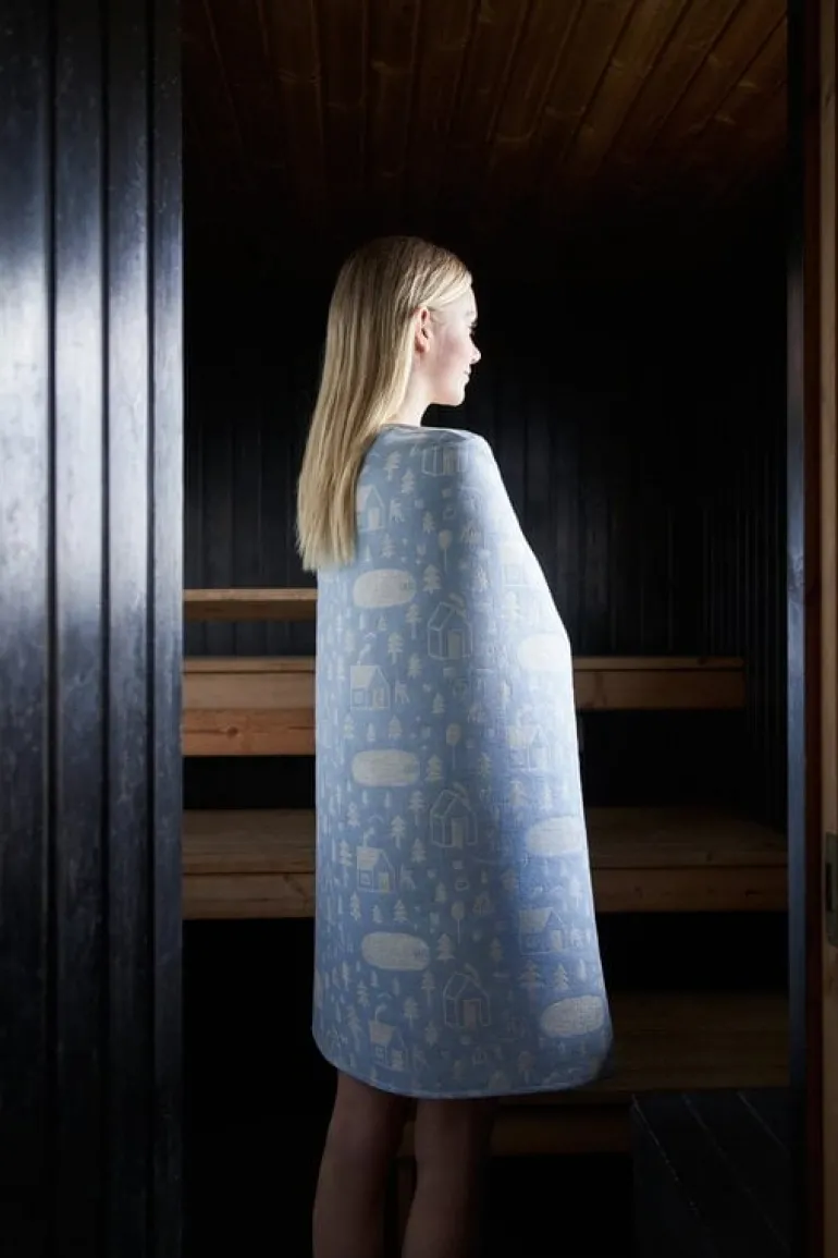 Kaunistes badlakan Sauna är dekorerat med ett fascinerande mönster, som skildrar stugor, skogar och dammar – med samma känsla av rofylldhet som råder i de finska sjölandskapen. Mönstret, som är skapat av Riikka Laakso, fortsätter på handdukens andra sida i motsatt kontrasterande nyanser.