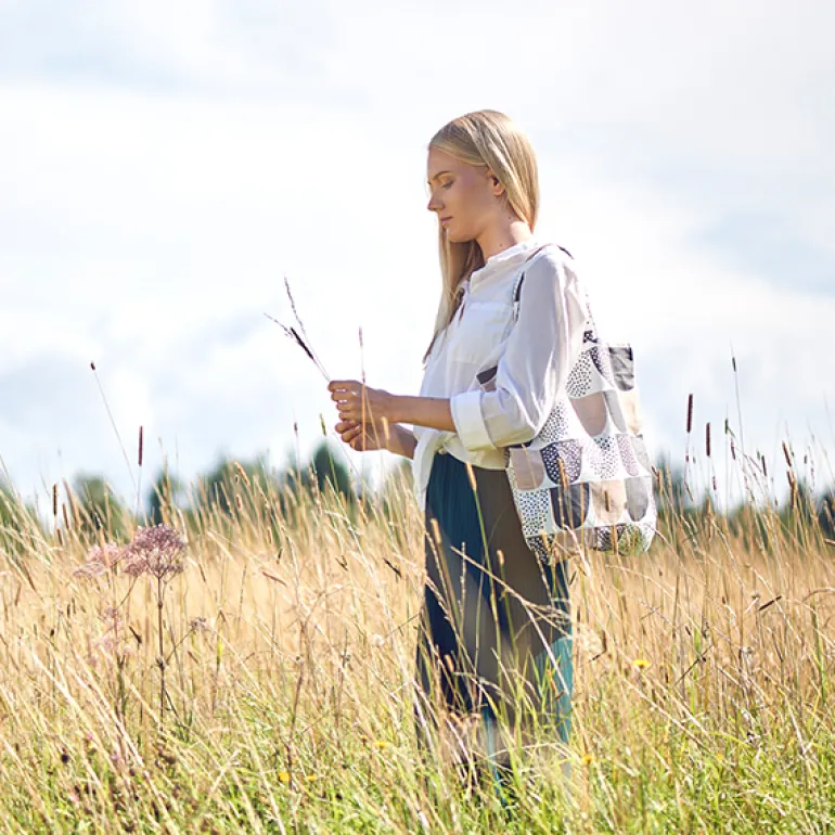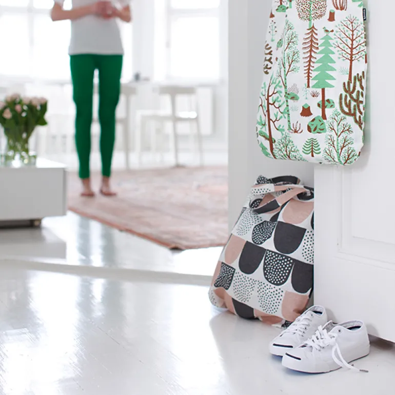 Toteväskan Sokeri från Kauniste är designad av Hanna Konola från Finland. Finns i två färger. Materialet är en blandning av linne och bomull.