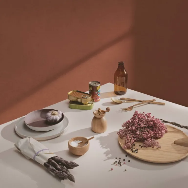 Kay Bojesen, som är mest känd för sina träleksaker, designade Menageri-kollektionen under 40-talet. Menageri-produkterna är framställda av certifierat trä, som ger det dukade bordet inslag av naturlig värme och mjukhet. Träets naturligt böljande linjer och vackra ådring skapar en intressant kontrast till matporslin i glas eller keramik.
