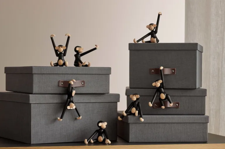 Kaj Bojesens Apa är en älskad klassiker inom skandinavisk design. Den här miniapan är tillverkad av mörkbetsad ek och är 9,5 cm hög. Observera att på minstingen i Bojesens apfamilj är inte huvudet rörligt.