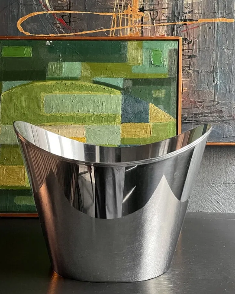 Kay Bojesens flaskkylare hjälper till att hålla flera flaskor kylda samtidigt – den här generöst tilltagna flaskkylaren är dubbelt så stor som Bojesens originalkylare i silver. När flaskkylaren är fylld med iskuber fungerar den lika bra till kylning av champagne- och ölflaskor som till servering av uppfriskande drycker på barnkalas eller under filmkvällar. Flaskkylarens vackert välvda design gör att den kan användas som imponerande blickfång mitt på ett festdukat bord, och glänsa med sin yta i polerat, rostfritt stål som reflekterar omgivningens färger och former.