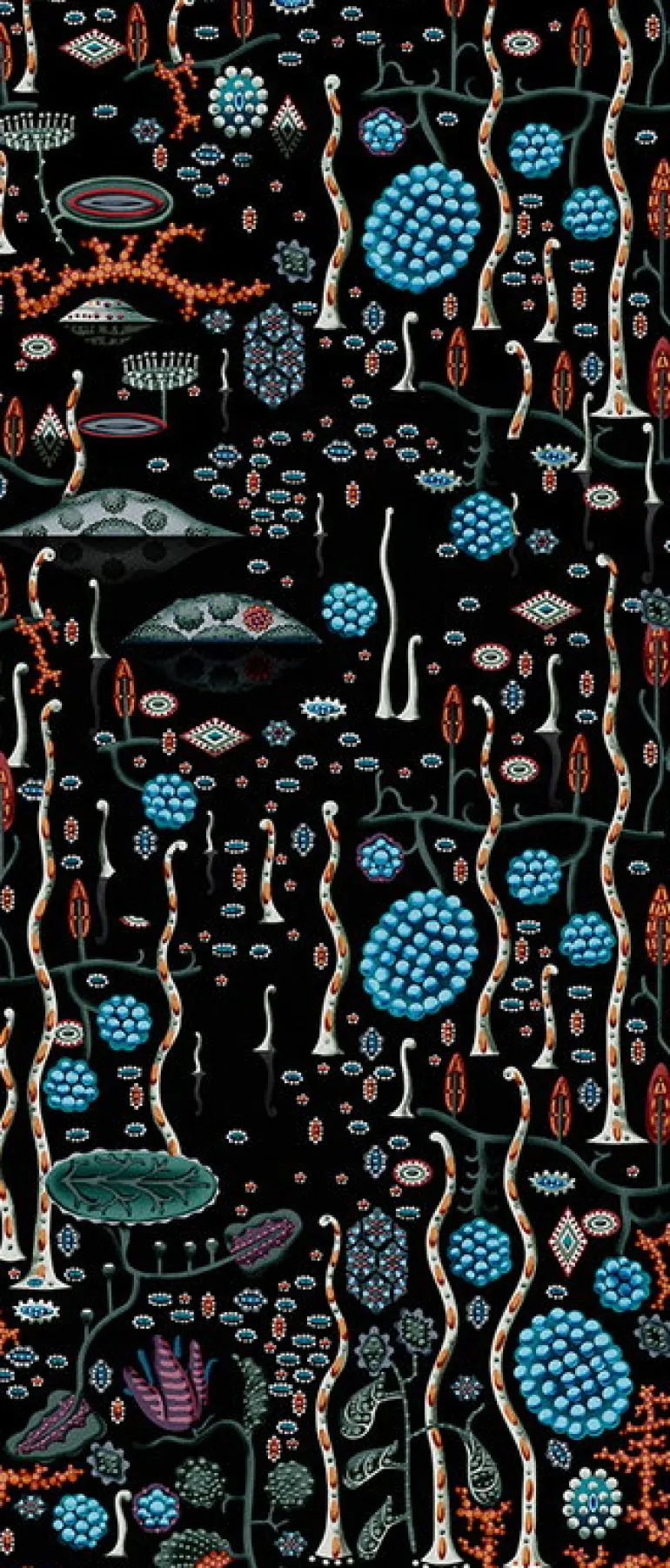 Klaus Haapaniemis tapet Black Lake är dekorativt illustrerad med mystiska sjölevande växter och djur. Klaus Haapaniemi, ett av de största namnen inom modern finsk design, har designat en tapetkollektion full av intensiva färger och djärva mönster med inspiration från nordisk natur och mystik. De dekorativa tapeterna blir en fin kontrast i en minimalistisk dekor, medan de kompletterar stämningen i redan färgglada inredningar. Tapeterna, som tillverkats av icke-vävt papper av hög kvalitet, är lätta att hänga rakt på väggen med färdigblandat lim.