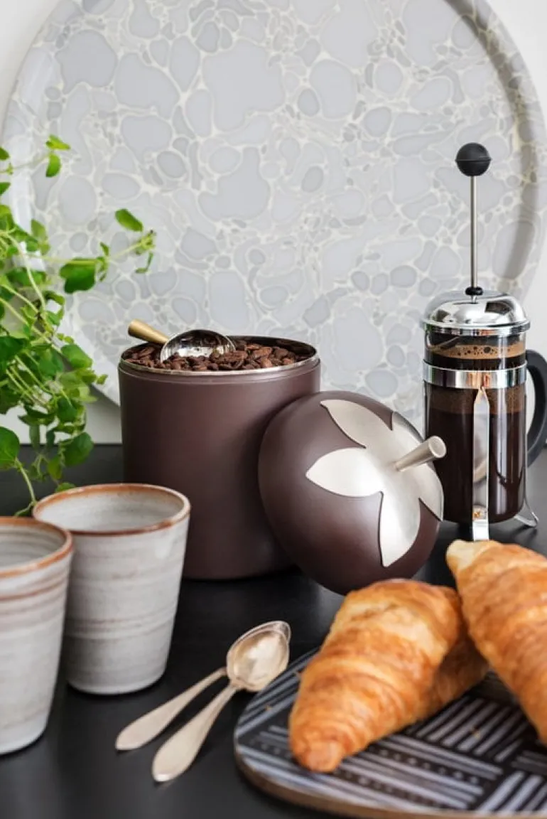 Blad-burken från Klong har smyckats med en charmig lövdekoration. Stålburken, som designades av Eva Schildt, är perfekt för lagring av kaffe, te eller socker. Utan locket kan burken användas för servering. Blad-burken kommer med en söt liten sked för mätning eller servering.