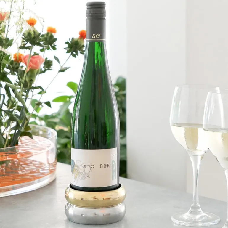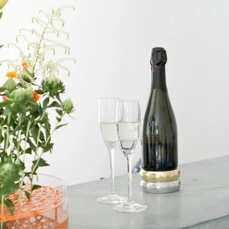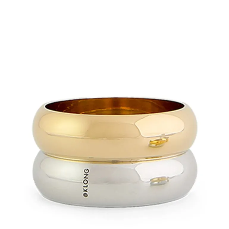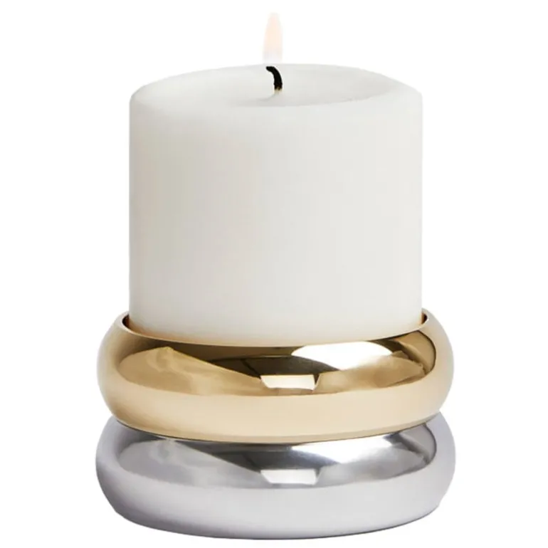 Marriage-ljushållaren av Klong är en vacker förening av polerad aluminium och mässing. Eva Schildt designade ljushållaren som består av två ringar ovanpå varandra. Med en diameter på 9,5 cm är Marriage tänkt för bordsljus.