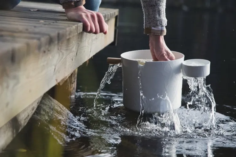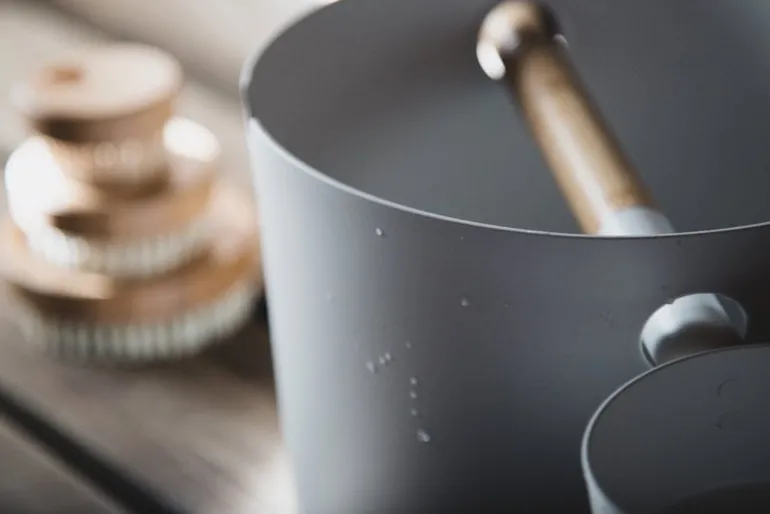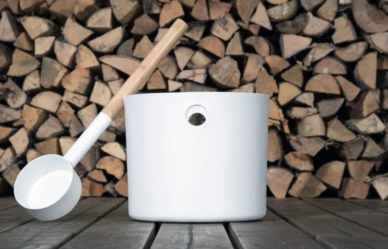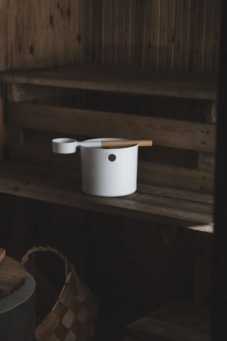 KOLO:s Bucket and Ladle-set designades av Brita Flander 2016 och tar modern, innovativ design till den traditionella bastun. Förutom att kasta vatten på bastuvärmaren kan skopan användas som handtag till hinken. Hinken och skopan är tillverkade av målat aluminium och skopan har ett handtag av ljus bambu. Hink och skopa-setet finns i de tidlösa färgerna svart och vit.
