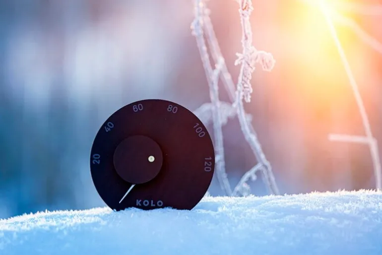 Kolos termometer är ett enkelt och stilfullt sätt att se om din bastu är tillräckligt varm: placera bara den runda mätaren på bastuväggen, kasta vatten på kaminen och se hur mätarens pekare börjar stiga! Den enkla termometern är tillverkad av aluminium och visar temperaturen upp till 120 grader.