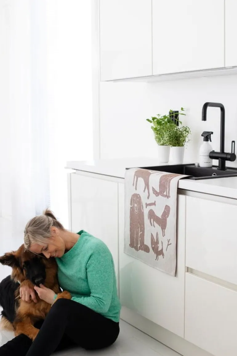 Kökshandduken Koirapuisto från Lapuan Kankurit är prydd med en flock glada hundar, tecknade av den finske illustratören Matti Pikkujämsä. Koirapuisto är finska för hundpark. Den svartvita färgpaletten ger handduken ett grafiskt utseende och mönstret upprepas på den andra sidan, men i motsatta färger. Kökshandduken är tillverkad av en blandning av linne och bomull av hög kvalitet, och den vävs i Finland i Lapuan Kankurits eget väveri.