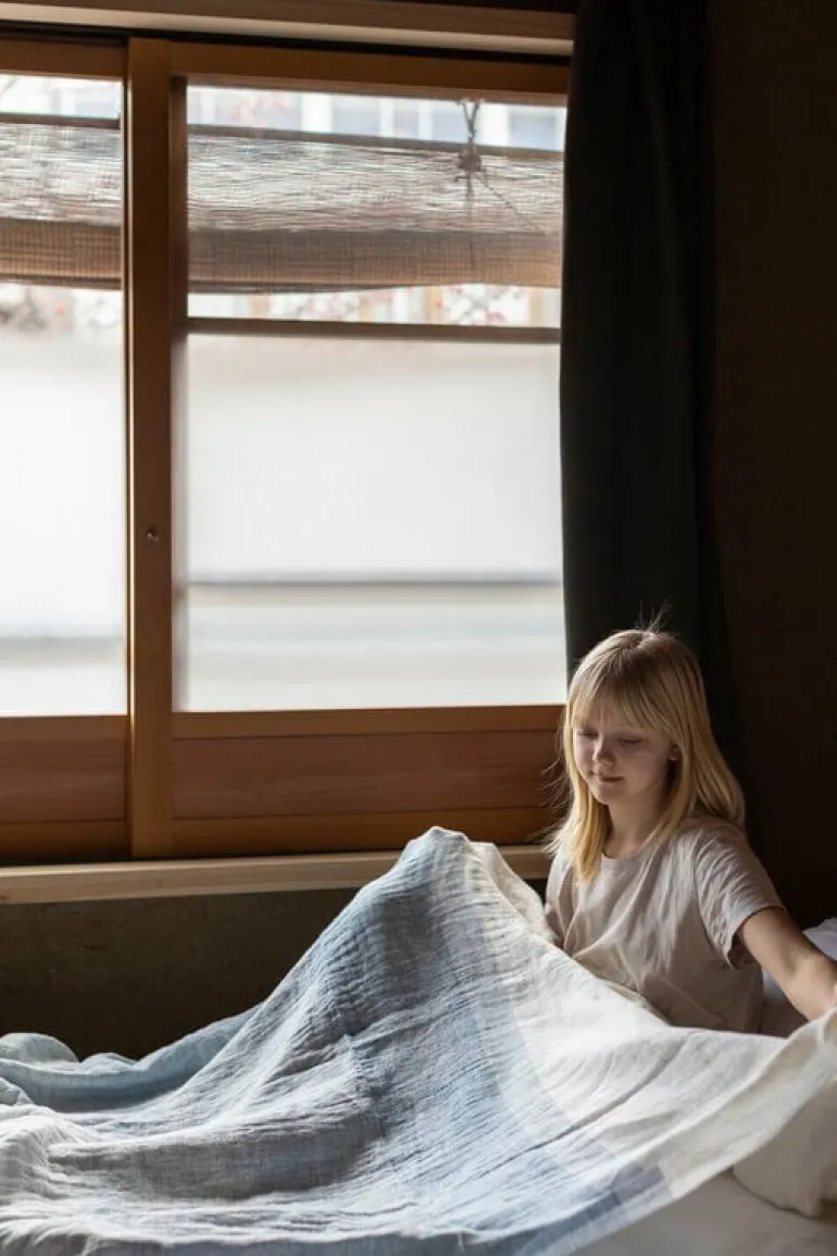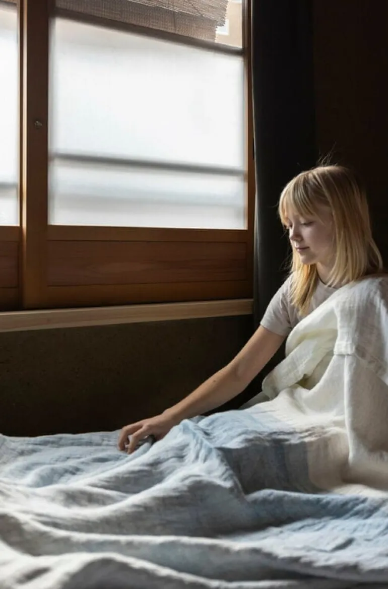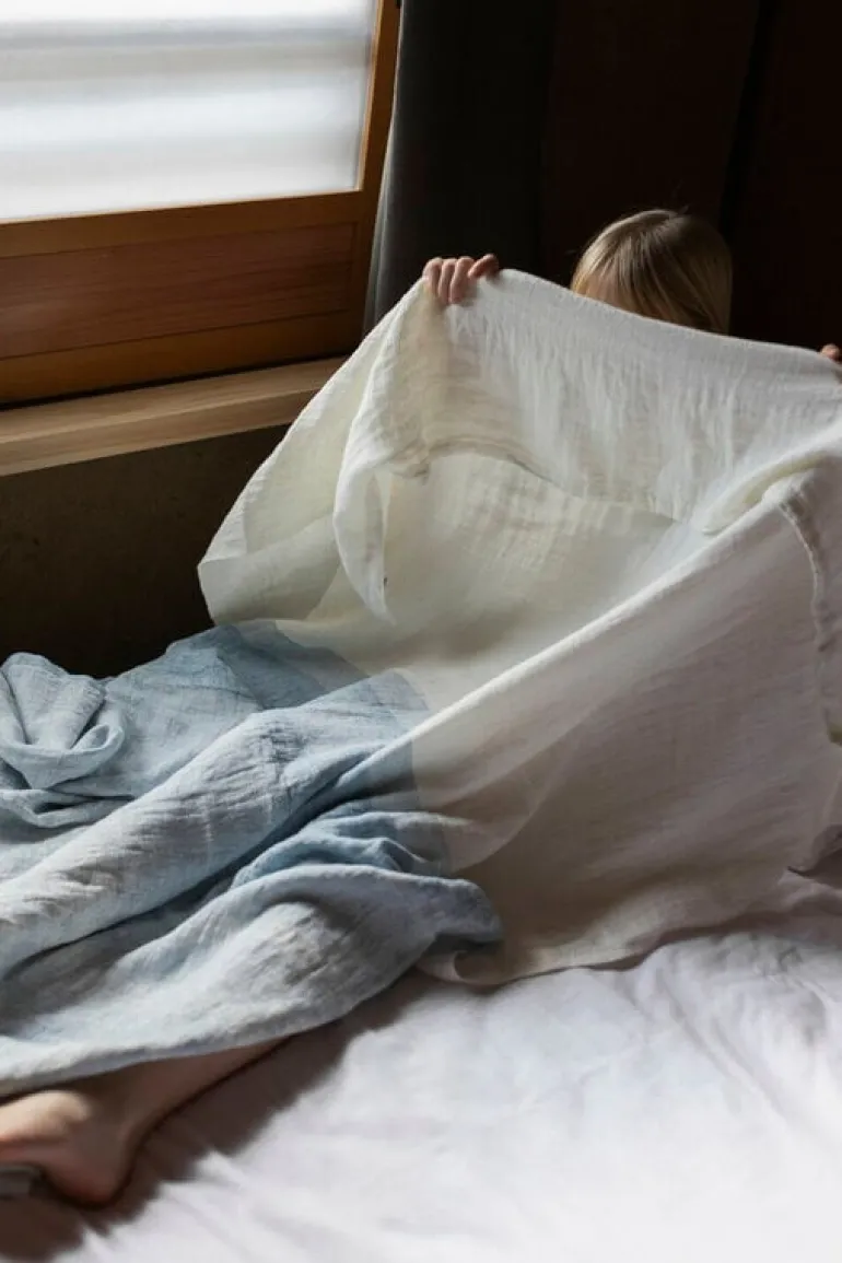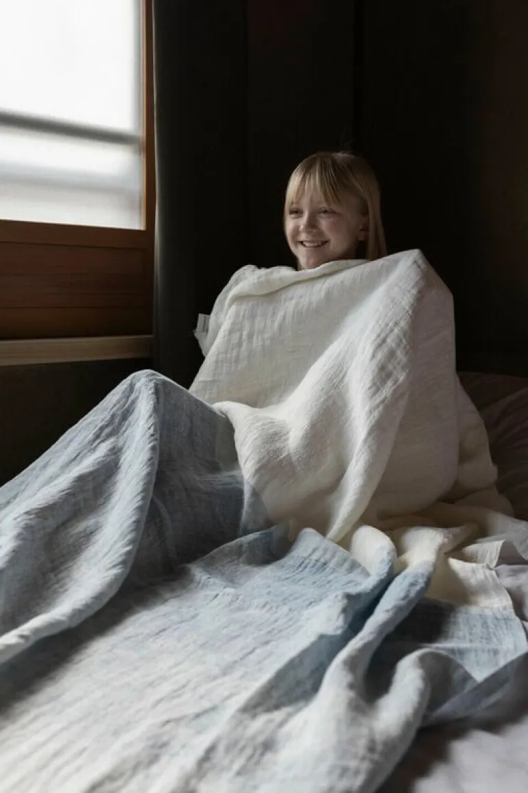 Tyget Saari tillverkas i Finland av tvättat, europeiskt linne, ett lättskött material med en naturligt lättsam framtoning. Du behöver inte stryka filten – de små rynkorna och vecken ger den en charmigt avspänd och naturlig look.