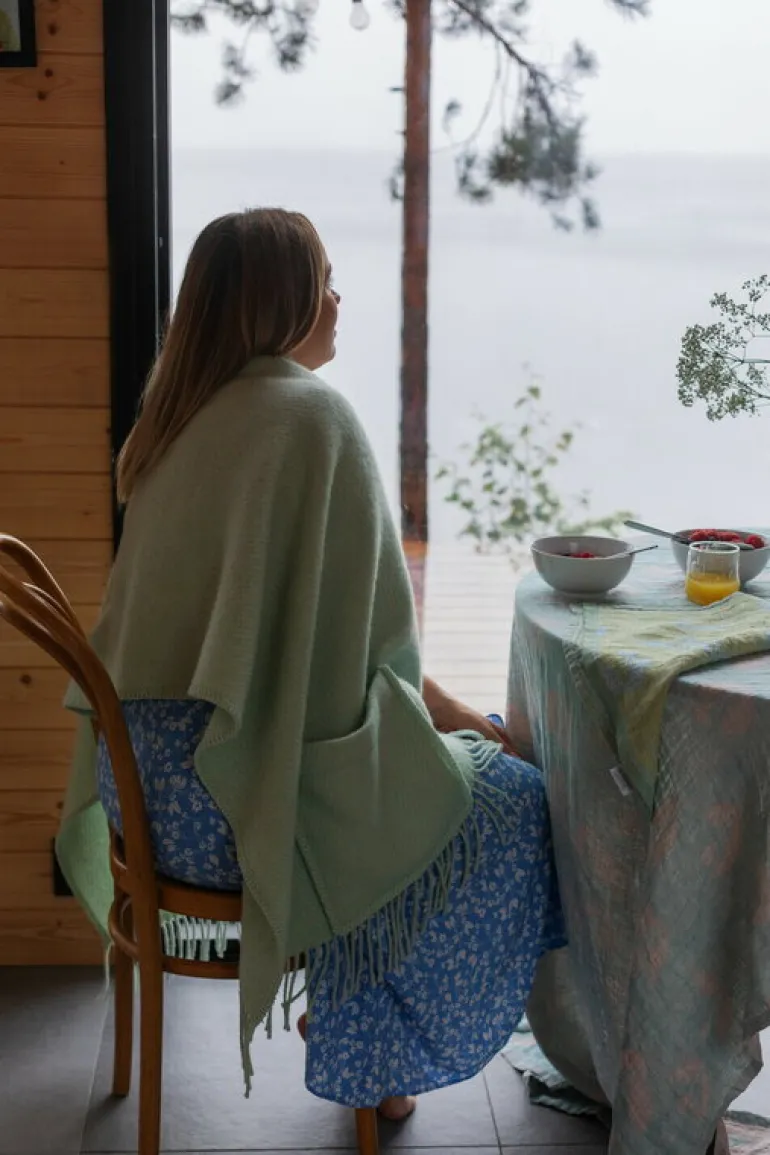 Uni fickshawl från Lapuan Kankurit håller dig varm under de kallaste vinterdagarna. Sjalen är tillverkad av mulesing-fri ull från Nya Zeeland som känns mjuk och behaglig mot bar hud. Praktiska fickor ser till att dina händer också hålls varma. Fransarna fulländar sjalens snygga utseende. Svep Uni-sjalen runt axlarna hemma när temperaturen utomhus börjar sjunka mot fryspunkten eller svep in dig i en stilfull sjal på kontoret eller på terrassen. Fickshawlen produceras i en sömnadsfabrik i Litauen.