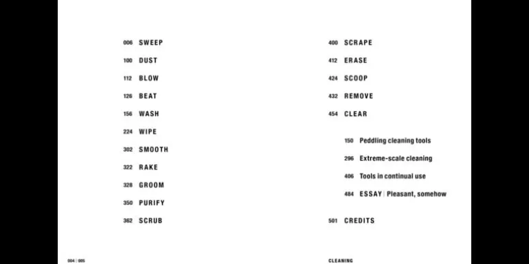 Cleaning från Lars Müller Publishers är en engagerande bok om städning, och de verktyg och metoder som används vid städning runt om i världen. Boken, som är illustrerad med vackra fotografier och teckningar, utforskar städning som ett gemensamt fenomen som förenar mänskligheten. Den tittar också på städningens kulturella och sociala betydelse, på ett poetiskt sätt. Redaktör för boken är Kenya Hara, en världsberömd japansk grafisk designer, curator och författare som bland annat har arbetat som art director för Muji och skrivit flera böcker om designteori. Boken består av totalt 504 sidor och 374 illustrationer.