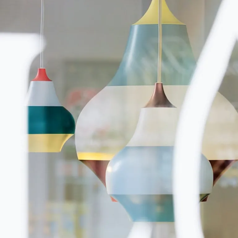 | Louis Poulsens Cirque är en kollektion med lekfulla pendellampor, designade av svenska Clara von Zweigbergk. Deras glada och randiga design har inspirerats av Tivoli i Köpenhamn: färgerna och mönstren på karuseller och andra snurrande föremål smälter samman till horisontella färgband när de är i rörelse. Den förtjusande formen på skärmen speglar de lökformade kupolerna, som också kan ses i nöjesparken. Pendellamporna Cirque ger ett behagligt ljus nedåt och passar utmärkt över soff- och matbord. |