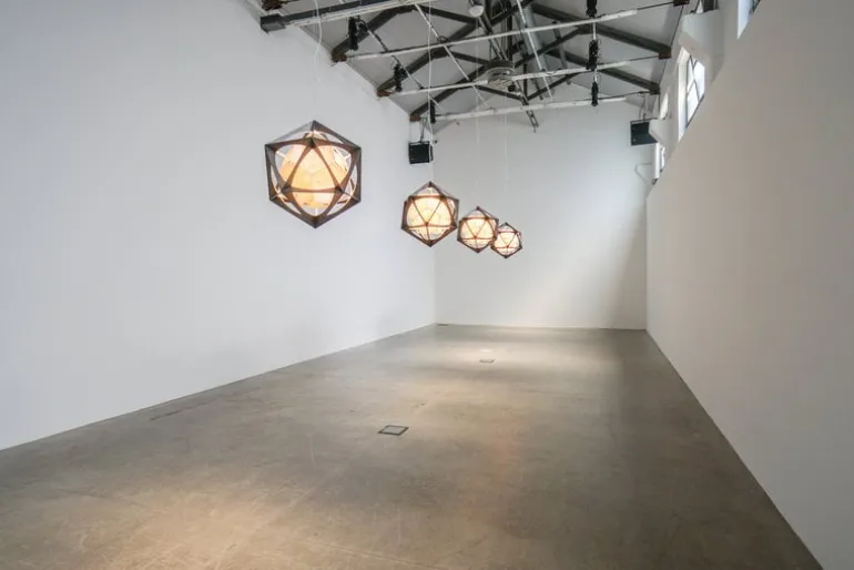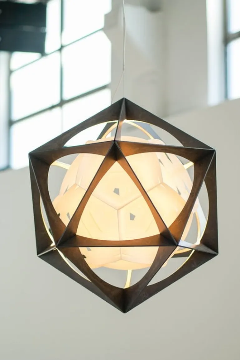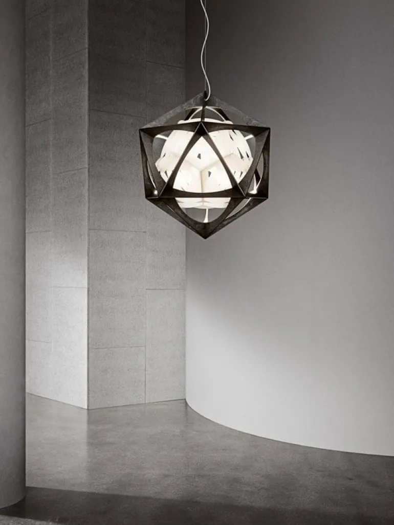 OE Quasi Light från Louis Poulsen är en imponerande storskalig lampskulptur från världserkända isländsk-danska designern Olafur Eliasson. Quasi Light består av en mörk aluminiumram och vita polykarbonatsreflektorer som ser ut att flyta inuti ramen. Alla formerna baseras på precis geometri: det yttre lagret är en 20-facetterad polyeder, icosahedron och den inre reflektorn är en dodekaeder med 12 pentagonala fronter. De 12 inbäddade LED-lamporna i ramen och reflektorn i mitten skiner ett bländfritt sfäriskt ljus och skapar ett spel med geometrin som förändras konstant beroende på vilken vinkel man ser det ifrån.