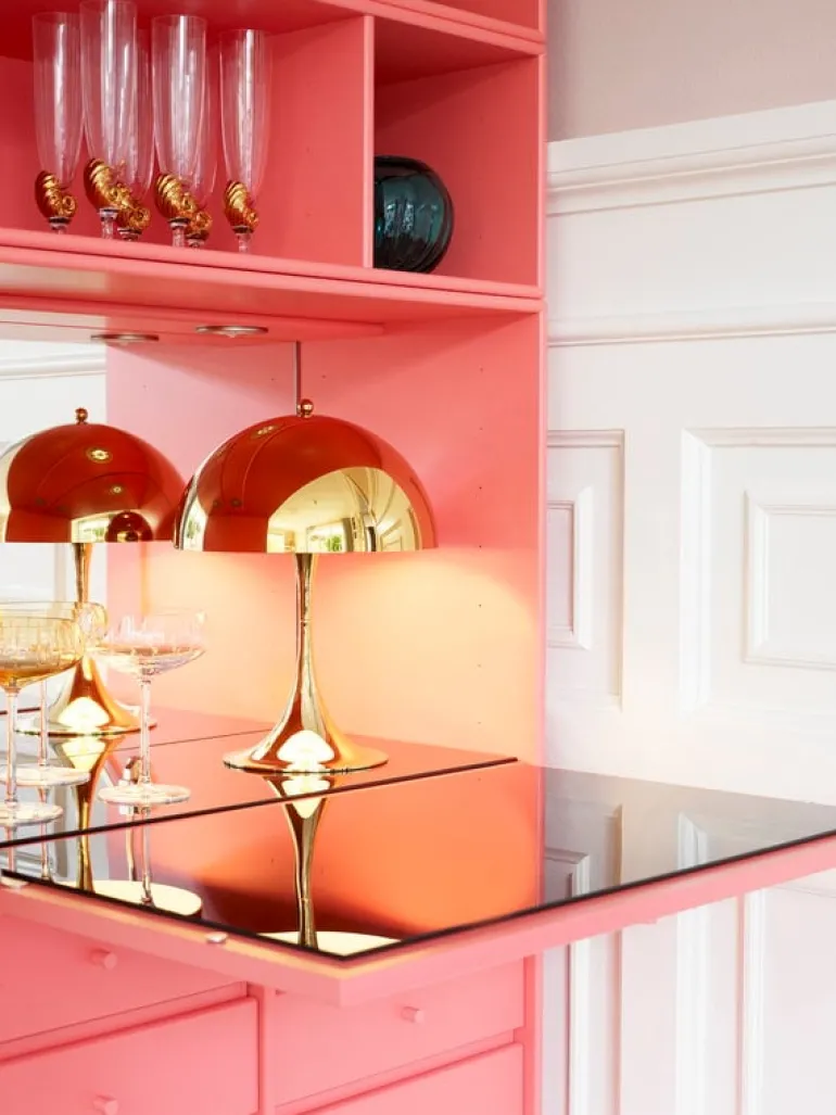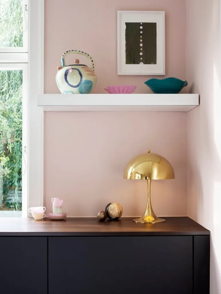 Louis Poulsens mässingsversion av bordslampan Panthella 250 har en yta med hög lyster som reflekterar sin omgivning och betonar armaturens skulpturala form.