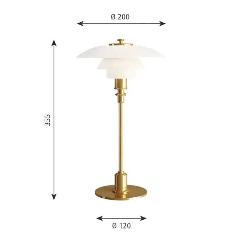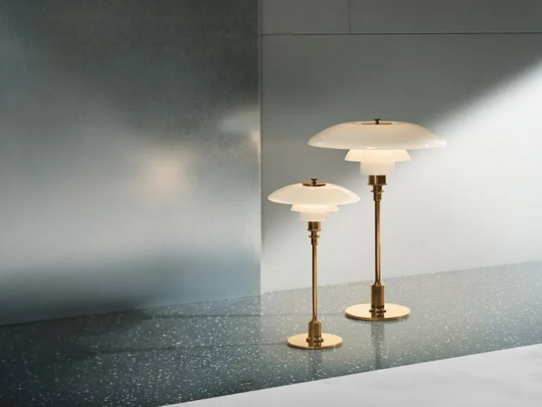 Den klassiska bordslampan PH 2/1 från Louis Poulsen har ett innovativt treskärmssystem som utvecklades av Poul Henningsen på 1920-talet. De tre munblåsta glasskärmarna med sandblästrad insida bildar en skulptural lampa som sprider ett trivsamt icke-bländande ljus och bidrar med tidlös elegans till alla rum. Basen i metalliserad mässing ger bordslampan PH 2/1 ett varmt, sofistikerat ljus.