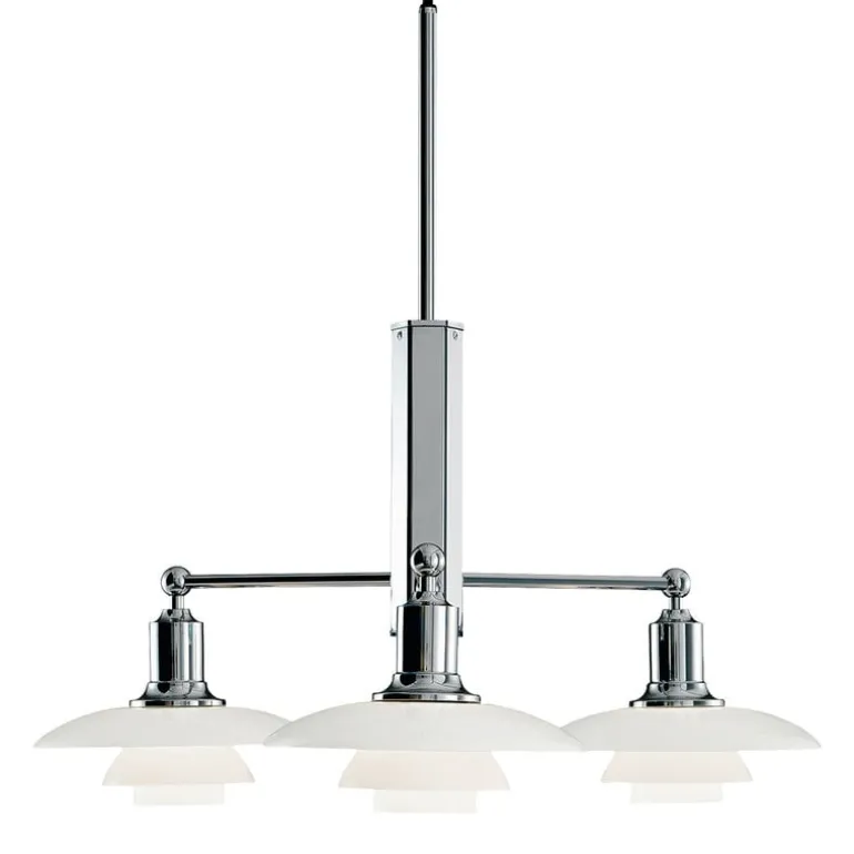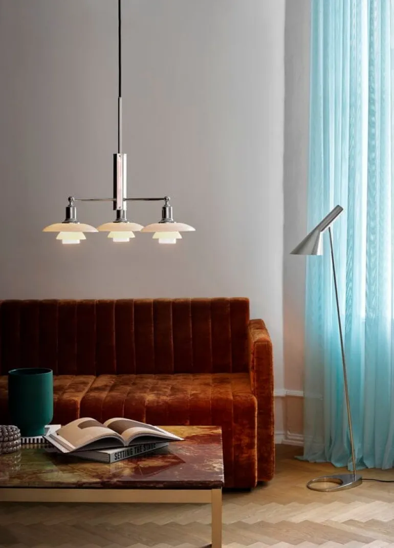 Louis Poulsens stora pendellampa PH 2/1 består av tre skärmar i vitt opalglas och en mässingsram med högglansig, förkromad yta. Med sin ansenliga diameter på 68 cm utgör PH 2/1 Stem en imponerande ljuskrona i stora vardagsrum och salonger. PH 2/1 Stem har ett innovativt treskärmssystem som utvecklades av Poul Henningsen på 1920-talet. De tre munblåsta glasskärmarna med sandblästrad insida bildar en skulptural lampa som sprider ett trivsamt icke-bländande ljus och bidrar med tidlös elegans till alla rum. Krombasen med sin lyster ger pendellampan PH 2/1 Stem en modern, sofistikerad look.