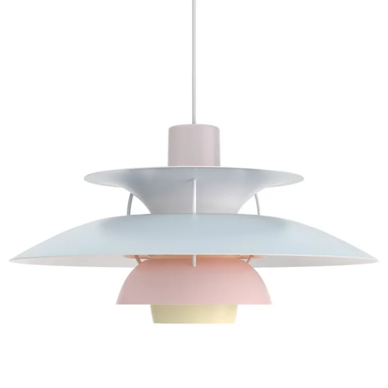 Louis Poulsens taklampa PH 5 Pastels ger den klassiska designen en fräsch, modern twist med en matt finish. De flerfärgade pastelltonerna skapar en lekfull atmosfär, som balanseras av de vita inre ytorna på lampans skärmar.