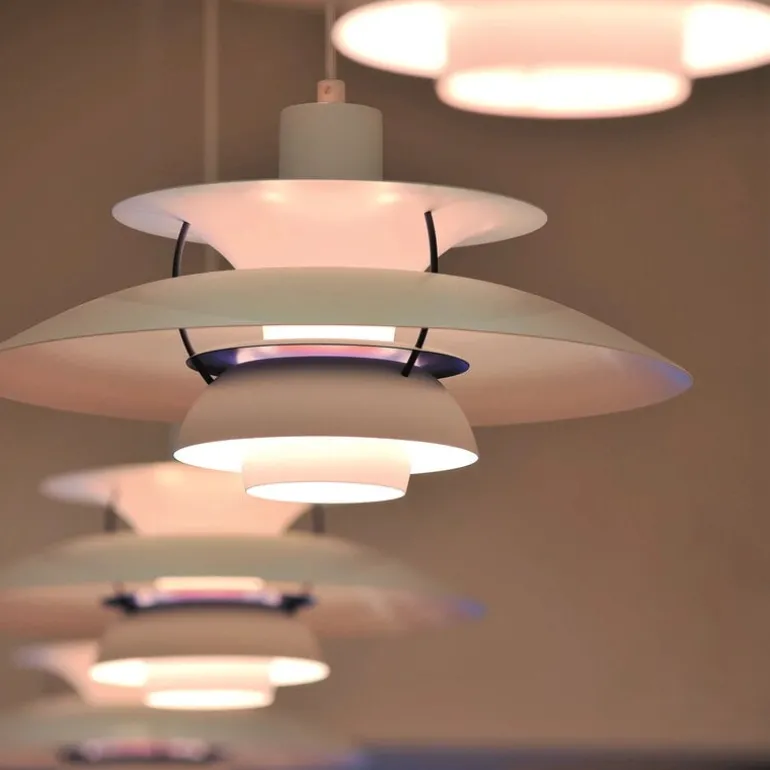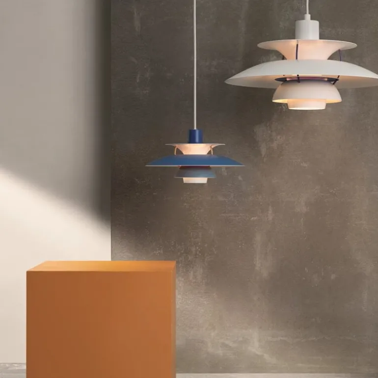 Louis Poulsens PH 5-pendellampa, som designades av Poul Henningsen 1958, är en dansk designikon som genast blev populär världen över. Pendellampans struktur är både elegant och innovativ: de vackra lagren förebygger skarpt sken och utgör trivsam belysning i alla rum. Dessutom ger den röda konen och den lilla blå reflektorn på pendelns insida ljuset en varmare ton. Pendellampans namn syftar på dess formgivare och diametern på 50 centimeter. PH 5-pendellampan är perfekt ovanför middagsbordet, men passar även att sitta högre upp i diverse designade utrymmen.