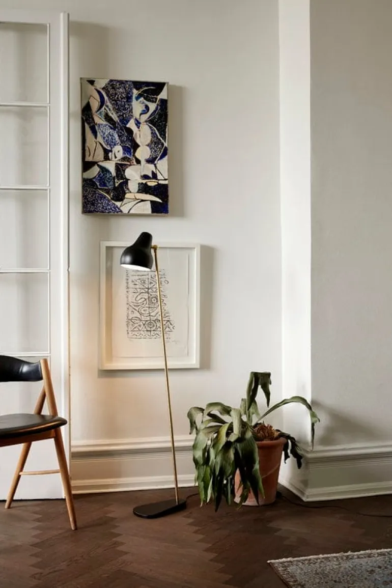 Louis Poulsens VL38-golvlampa har samma tidlösa och organiska design som seriens bordslampa, designad av arkitekt Vilhelm Lauritzen i slutet av 1930-talet för Radiohuset i Köpenhamn. Golvlampan består av en vacker mässingsarm och en vit, rundad skärm. Lamphuvudets vinkel kan justeras med ett litet gångjärn, och tack vare skärmens vita insida kastar lampan ett behagligt, nedåtriktat LED-ljus. Golvlampan VL38 är perfekt för alla läshörnor och kan även användas som allmänbelysning. Dessutom har den minimalistiska lampan en timerfunktion och kan ställas in så att den stängs av efter 4 eller 8 timmar.